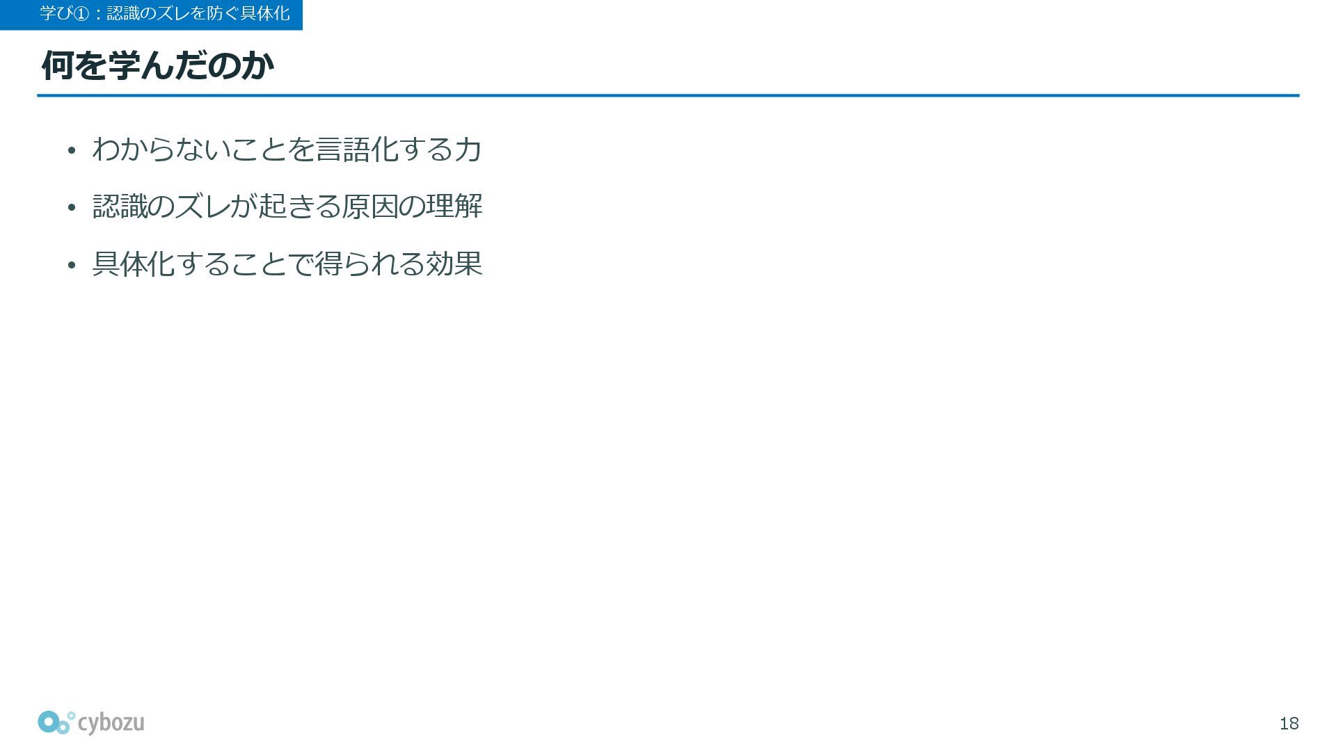 • わからないことを言語化する力 • 認識のズレが起きる原因の理解 • 具体化することで得られる効果 何を学んだのか 18 学び①:認識のズレを防ぐ具体化