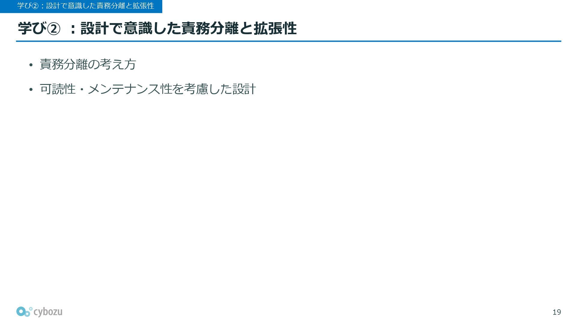 • 責務分離の考え方 • 可読性・メンテナンス性を考慮した設計 学び② :設計で意識した責務分離と拡張性 19 学び②:設計で意識した責務分離と拡張性