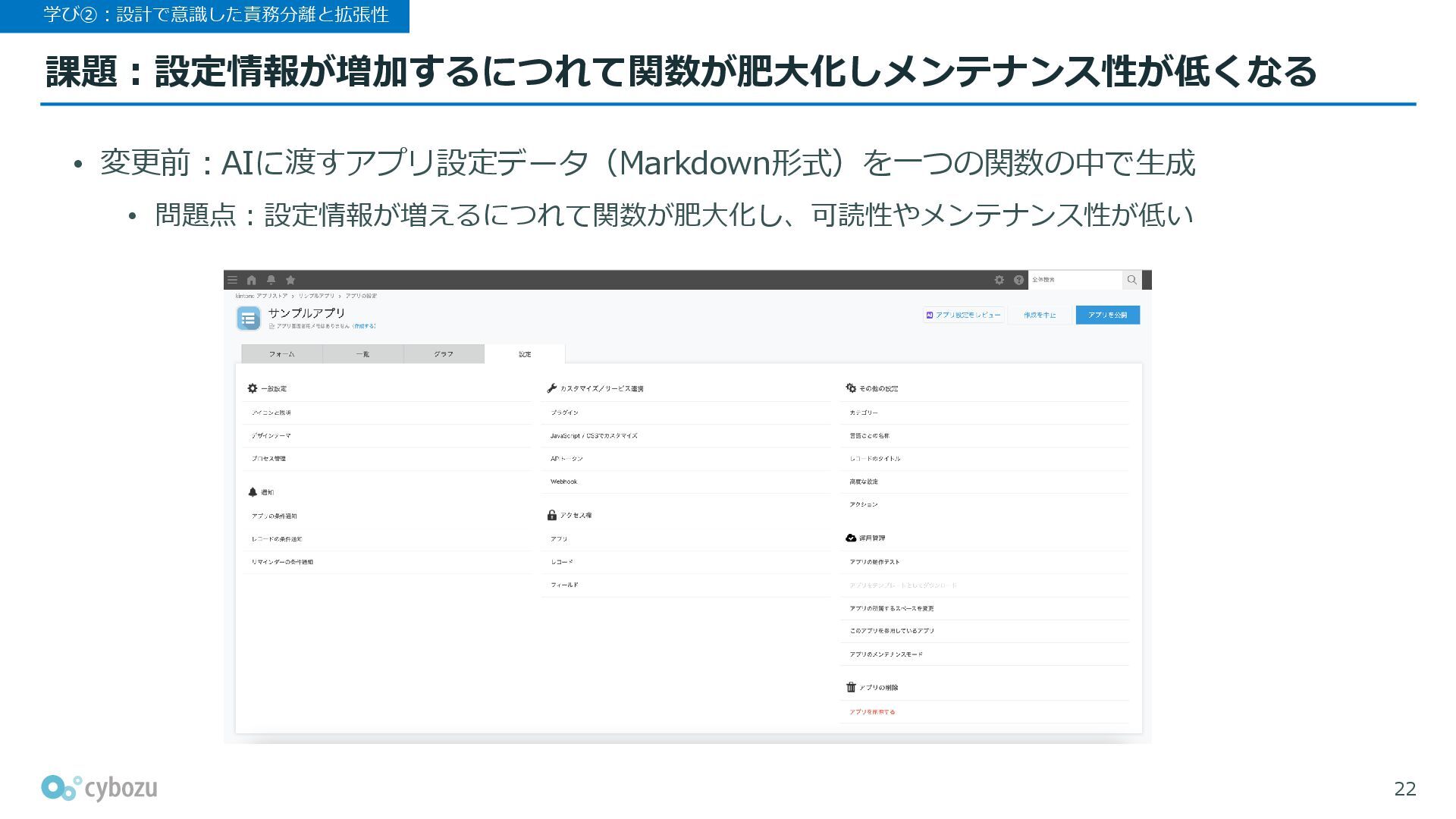 • 変更前:AIに渡すアプリ設定データ(Markdown形式)を一つの関数の中で生成 • 問題点:設定情報が増えるにつれて関数が肥大化し、可読性やメンテナンス性が低い 課題:設定情報が増加するにつれて関数が肥大化しメンテナンス性が低くなる 21 学び②:設計で意識した責務分離と拡張性 通知の 設定情報からAI向けの Markdown情報を構築
