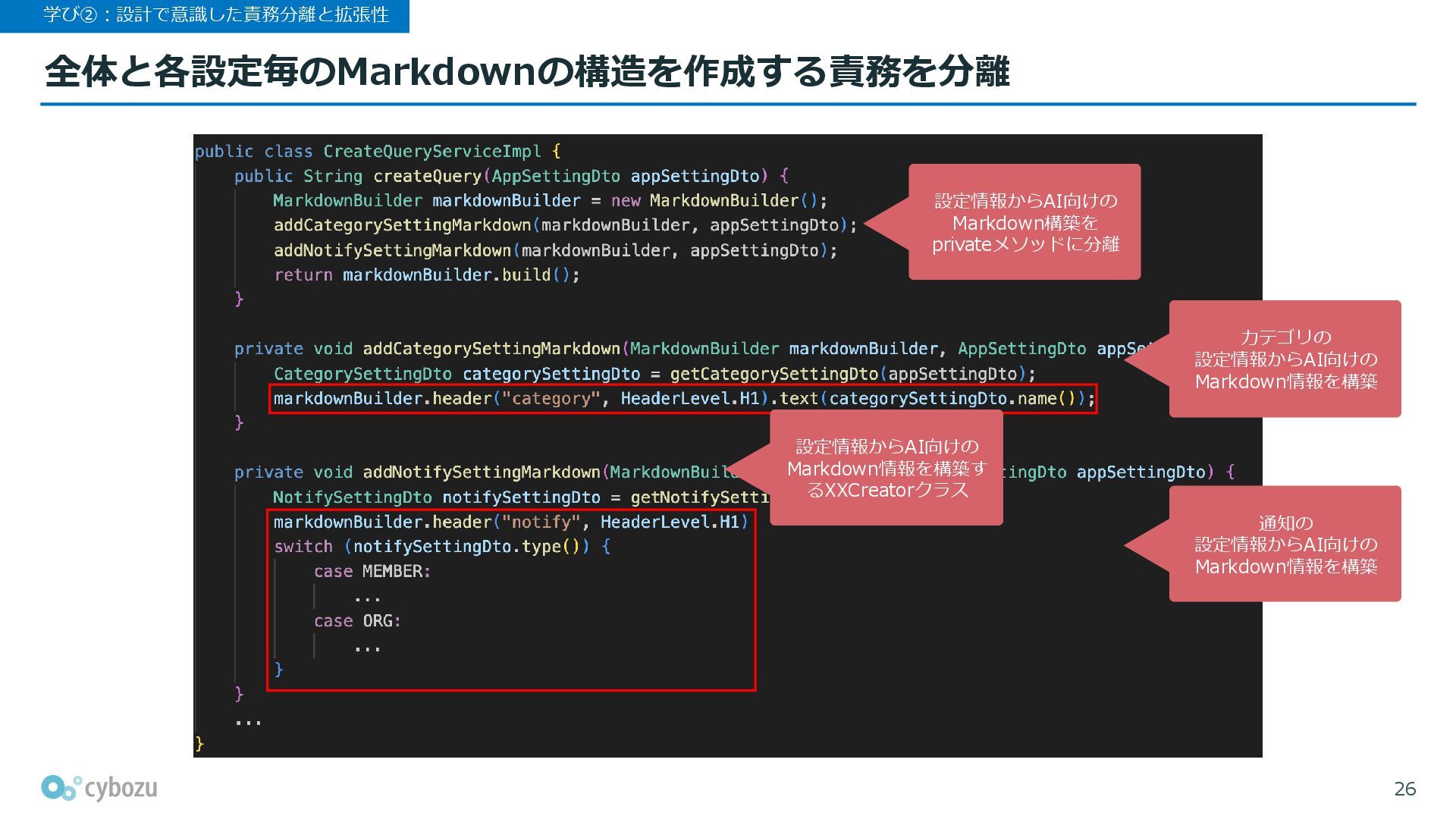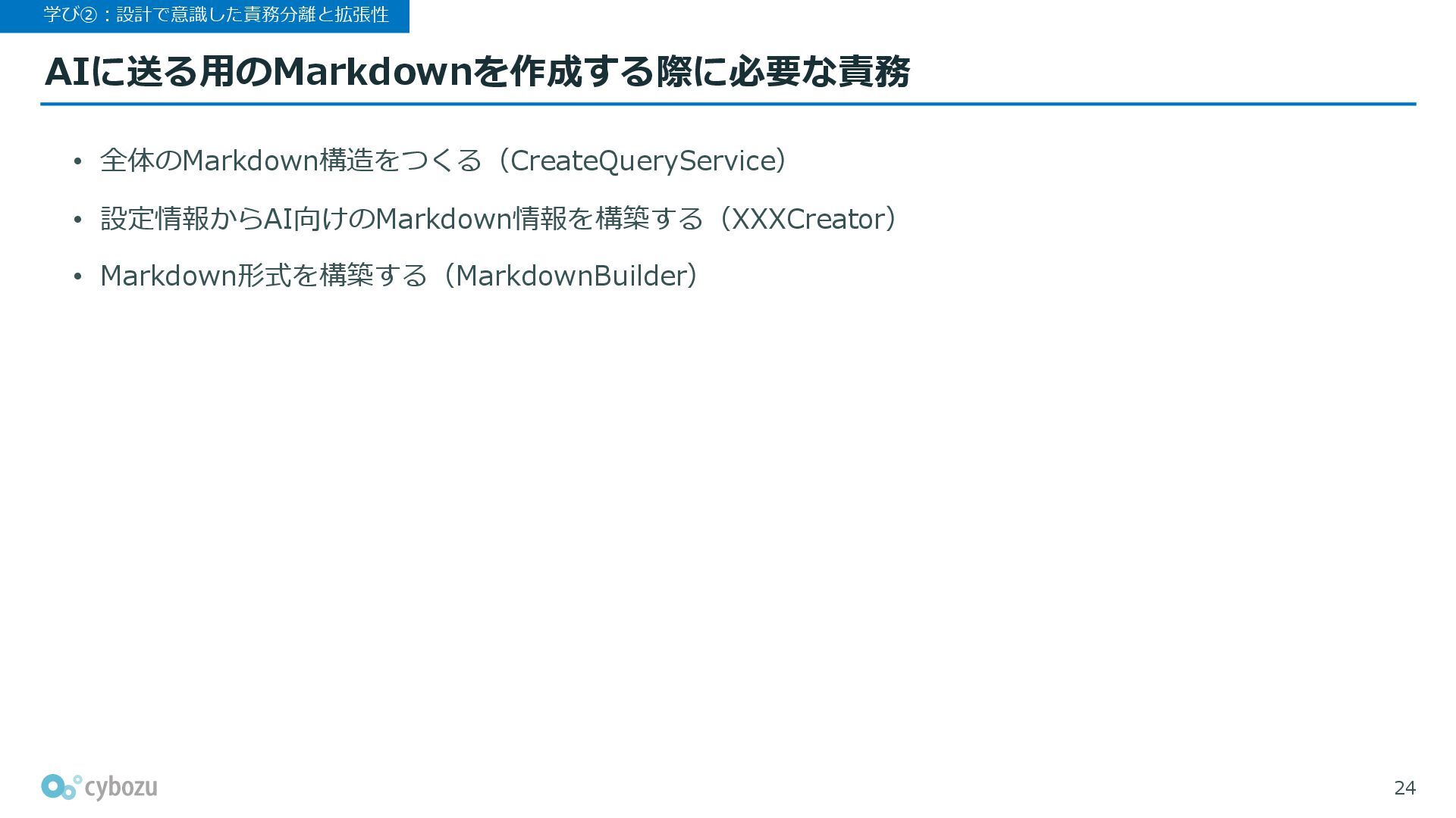 • 変更後:Markdownの構造を作る処理と、Markdownのデータに必要な設定の取得や加工する 処理を、責務に応じて分離 • 全体の構造を構築するロジックと設定値毎の実装詳細を分離 • 設定情報からAI向けのMarkdown情報を構築する専用のクラスを作成 解決策:AIに送るデータ構造とAIに送るデータ作成を行う処理を分離 23 学び②:設計で意識した責務分離と拡張性