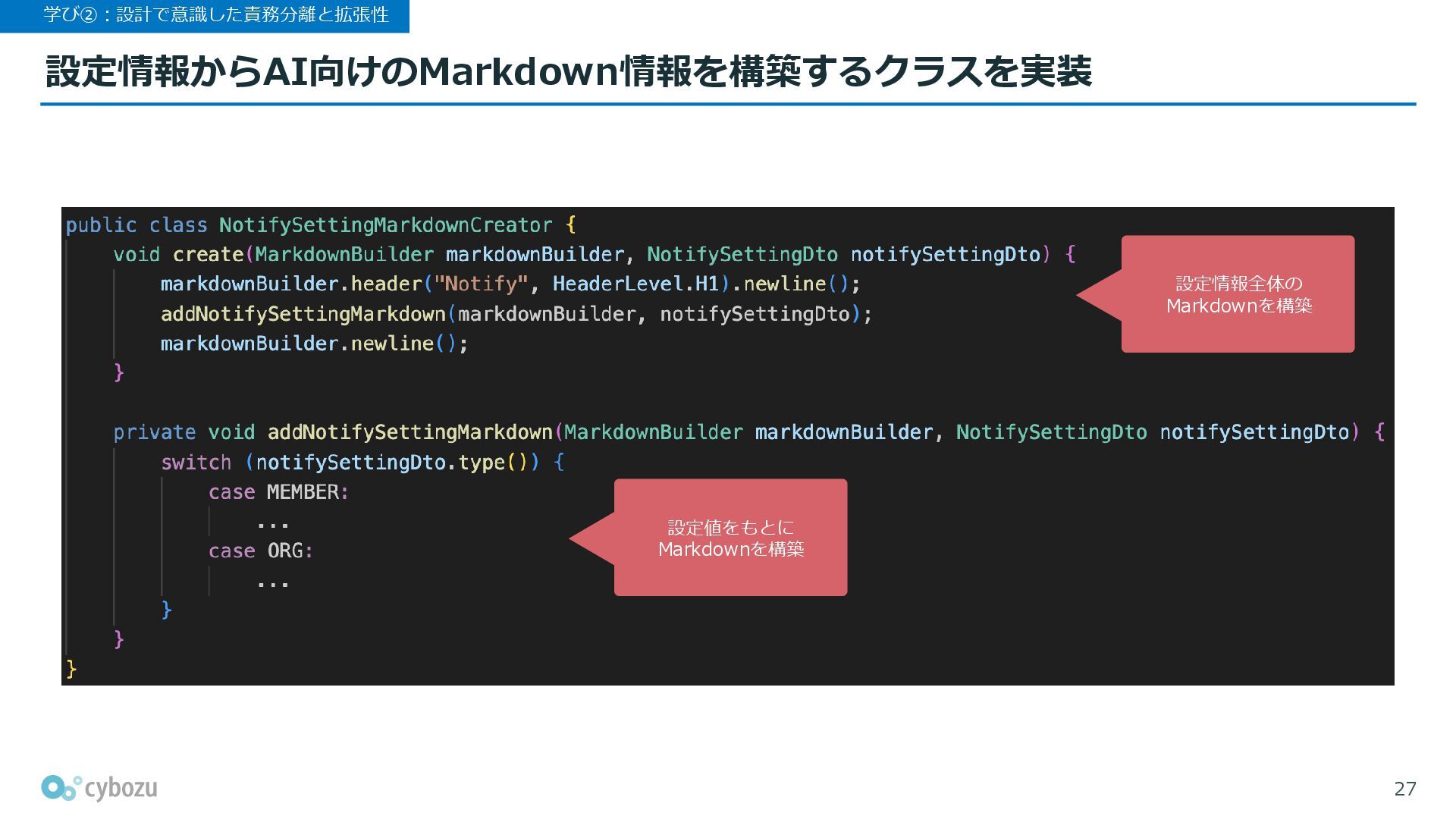 全体と各設定毎のMarkdownの構造を作成する責務を分離 26 学び②:設計で意識した責務分離と拡張性 通知の 設定情報からAI向けの Markdown情報を構築 カテゴリの 設定情報からAI向けの Markdown情報を構築 設定情報からAI向けの