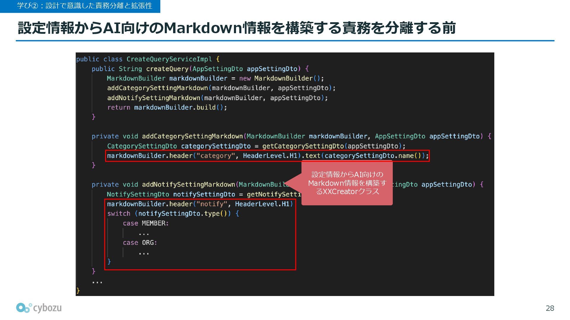 設定情報からAI向けのMarkdown情報を構築するクラスを実装 27 学び②:設計で意識した責務分離と拡張性 設定情報全体の Markdownを構築 設定値をもとに Markdownを構築