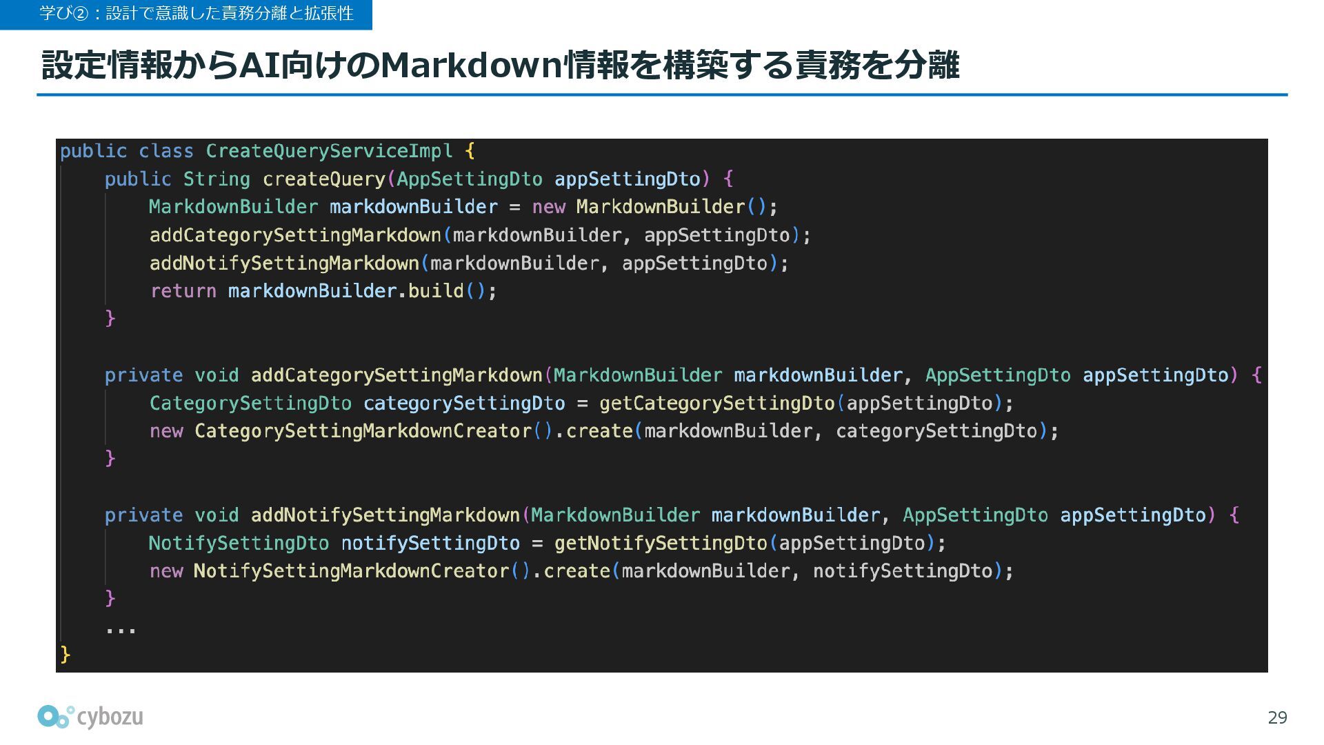 設定情報からAI向けのMarkdown情報を構築する責務を分離する前 28 学び②:設計で意識した責務分離と拡張性 設定情報からAI向けの Markdown情報を構築す るXXCreatorクラス