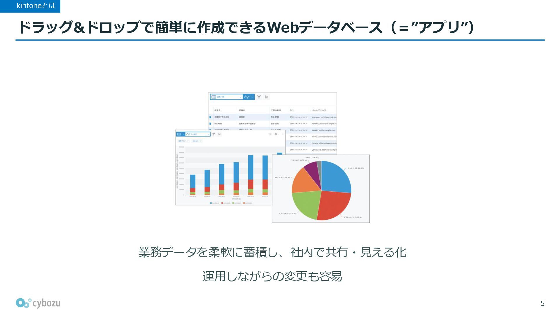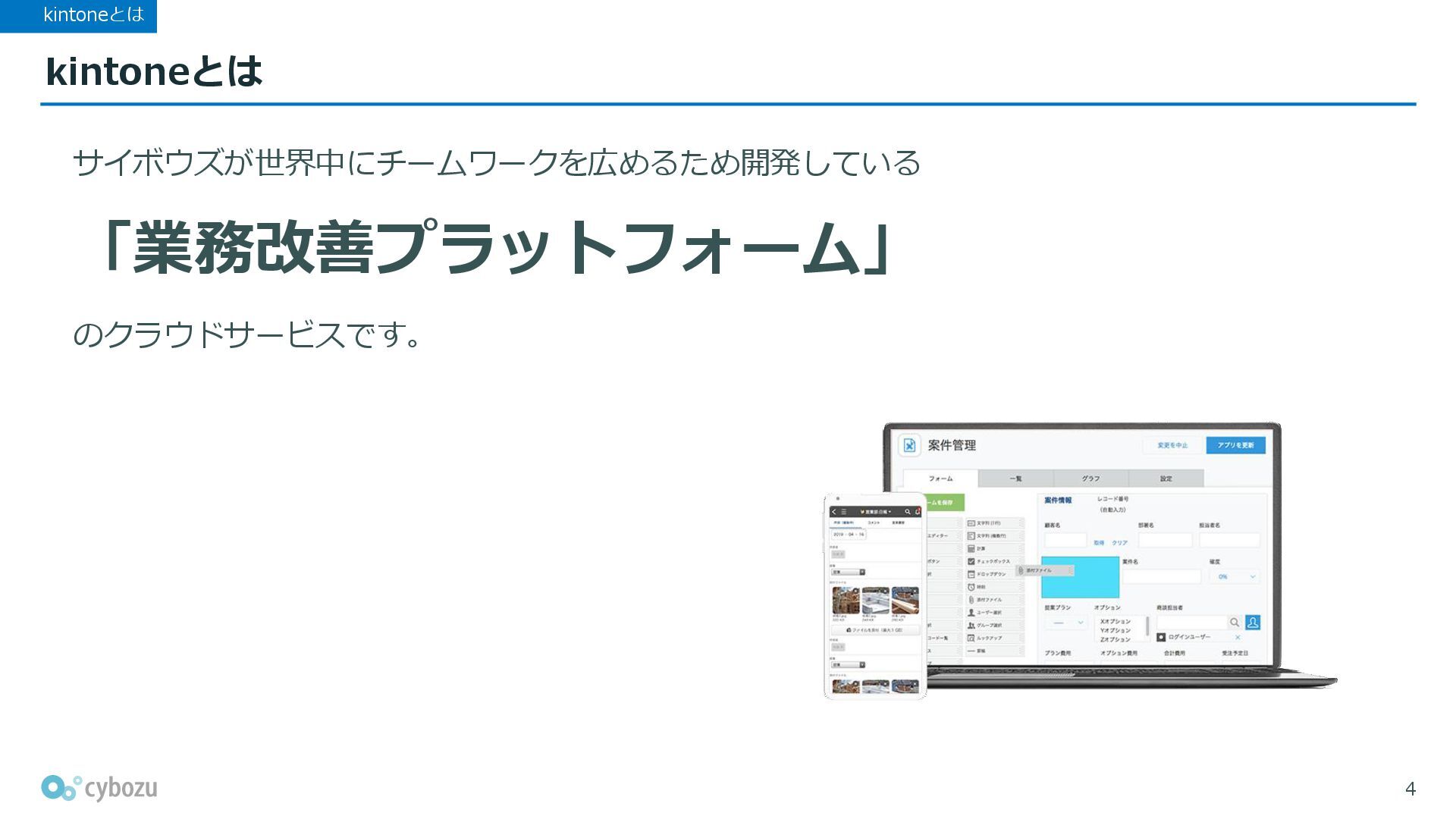サイボウズが世界中にチームワークを広めるため開発している 「業務改善プラットフォーム」 のクラウドサービスです。 kintoneとは 4 kintoneとは