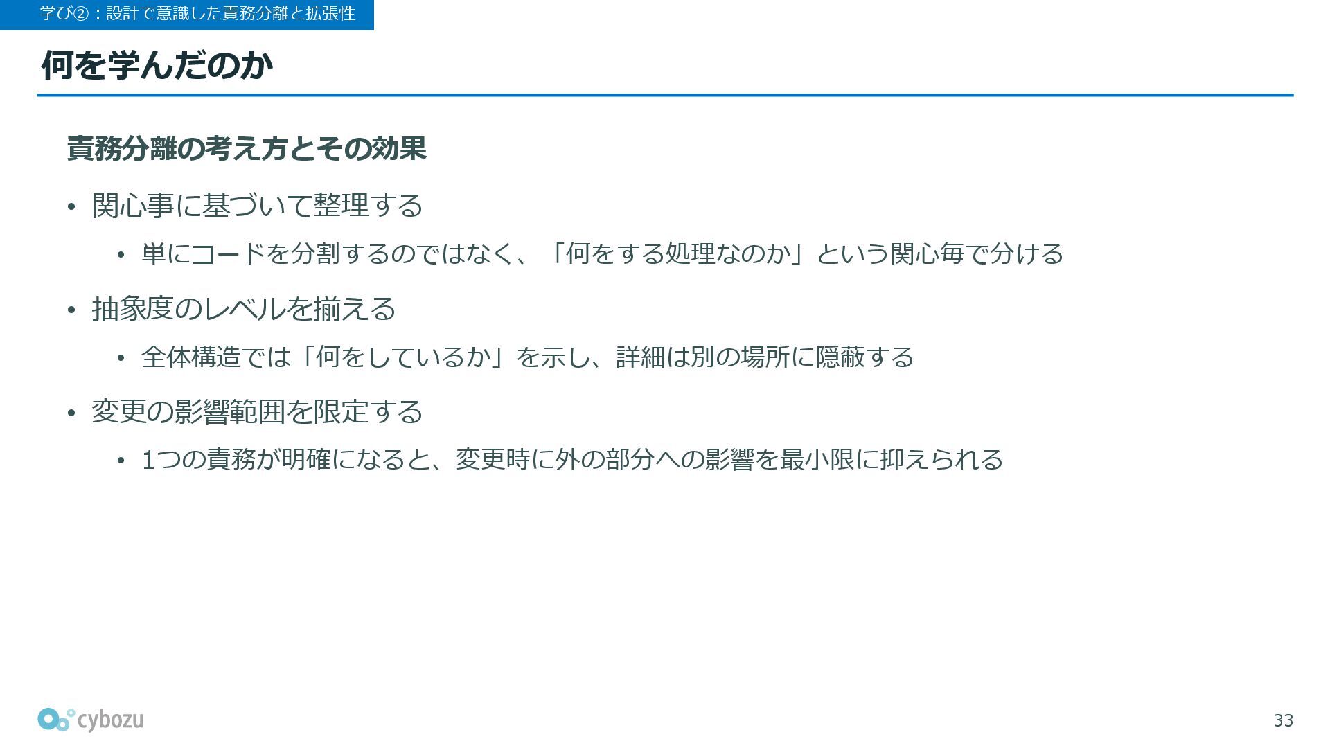 変更の影響範囲を限定する • 1つの責務が明確になると、変更時に外の部分への影響を最小限に抑えられる 何を学んだのか 33 学び②:設計で意識した責務分離と拡張性