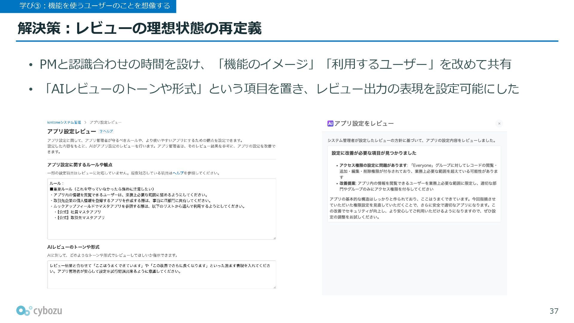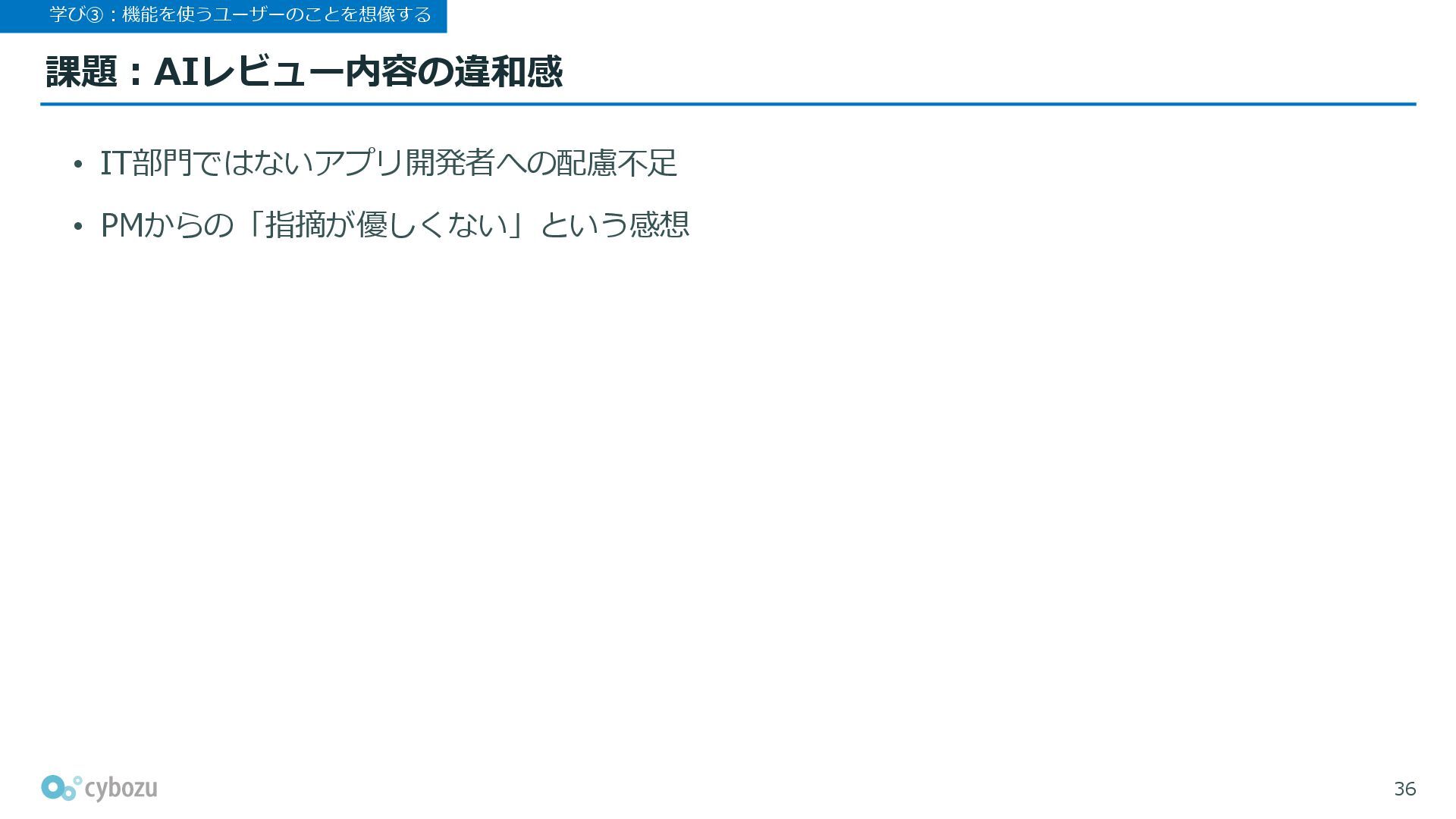 • IT部門ではないアプリ開発者への配慮不足 • PMからの「指摘が優しくない」という感想 課題:AIレビュー内容の違和感 36 学び③:機能を使うユーザーのことを想像する