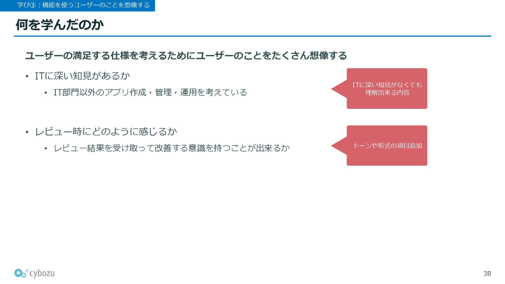 • PMと認識合わせの時間を設け、「機能のイメージ」「利用するユーザー」を改めて共有 • 「AIレビューのトーンや形式」という項目を置き、レビュー出力の表現を設定可能にした 解決策:レビューの理想状態の再定義 37 学び③:機能を使うユーザーのことを想像する
