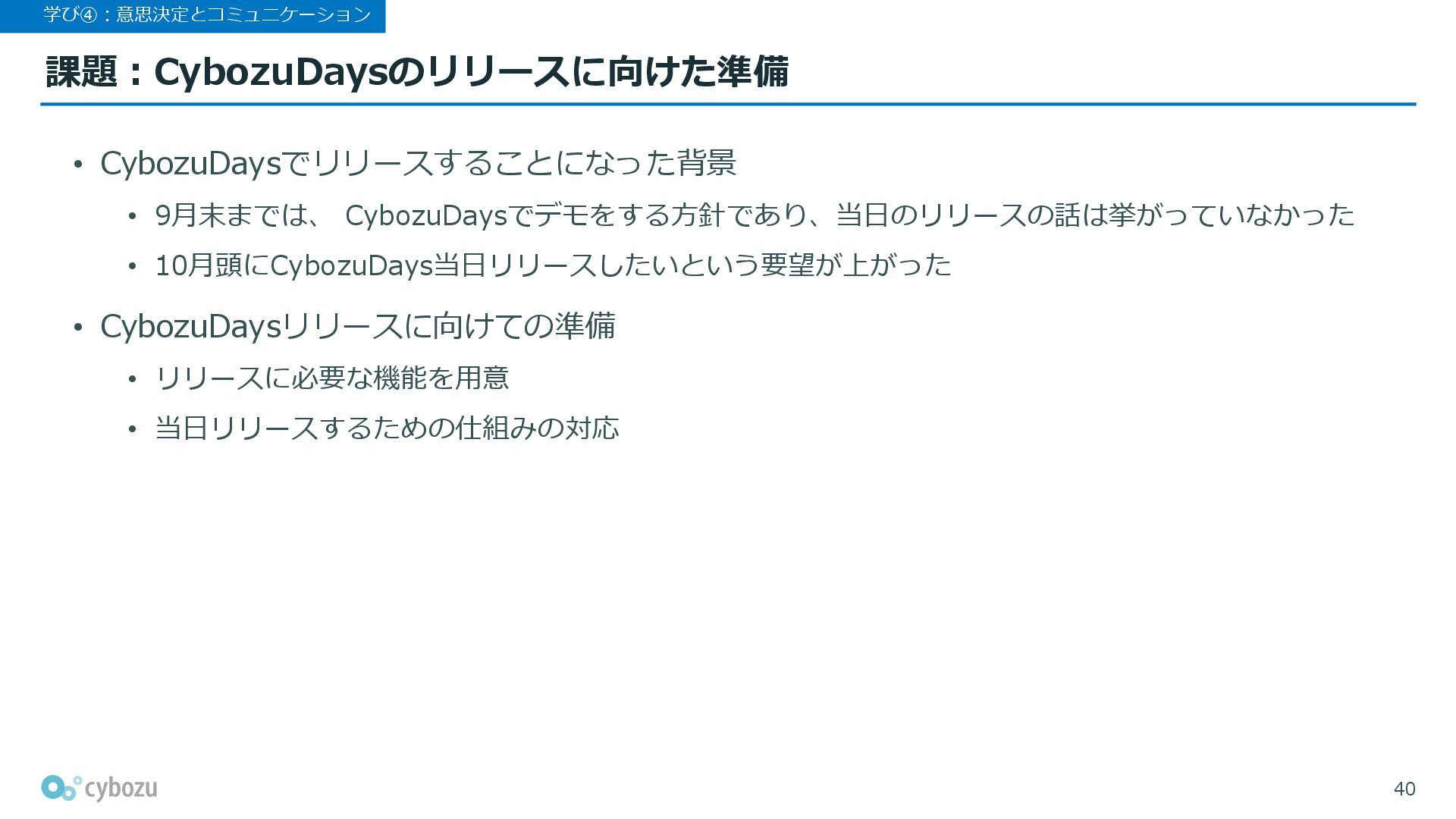 リリースに必要な機能を用意 • 当日リリースするための仕組みの対応 課題:CybozuDaysのリリースに向けた準備 40 学び④:意思決定とコミュニケーション