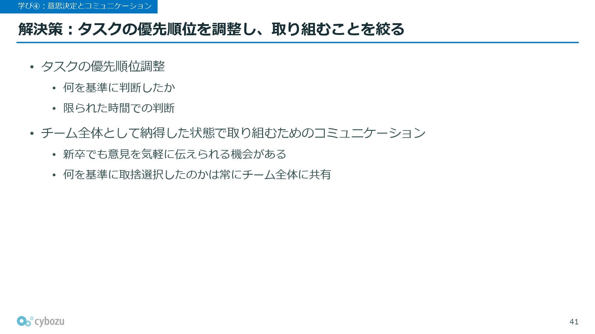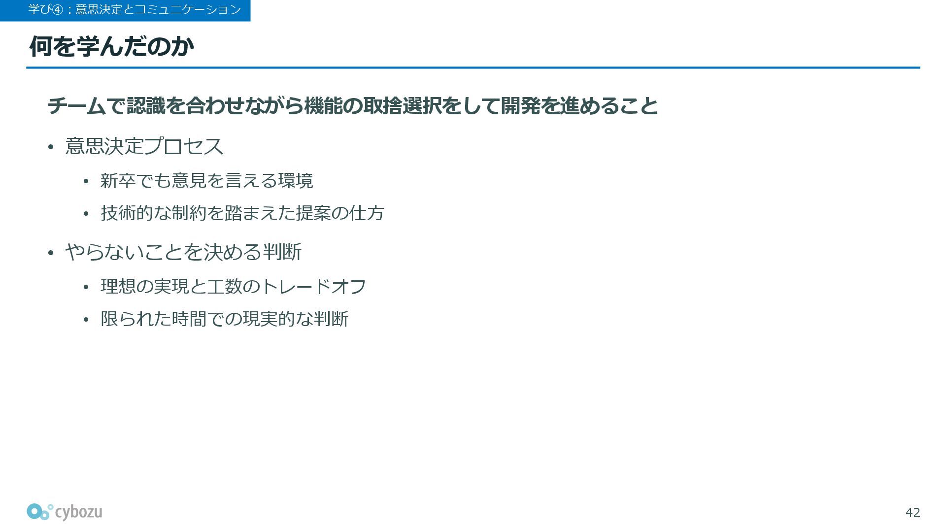• 何を基準に取捨選択したのかは常にチーム全体に共有 解決策:タスクの優先順位を調整し、取り組むことを絞る 41 学び④:意思決定とコミュニケーション