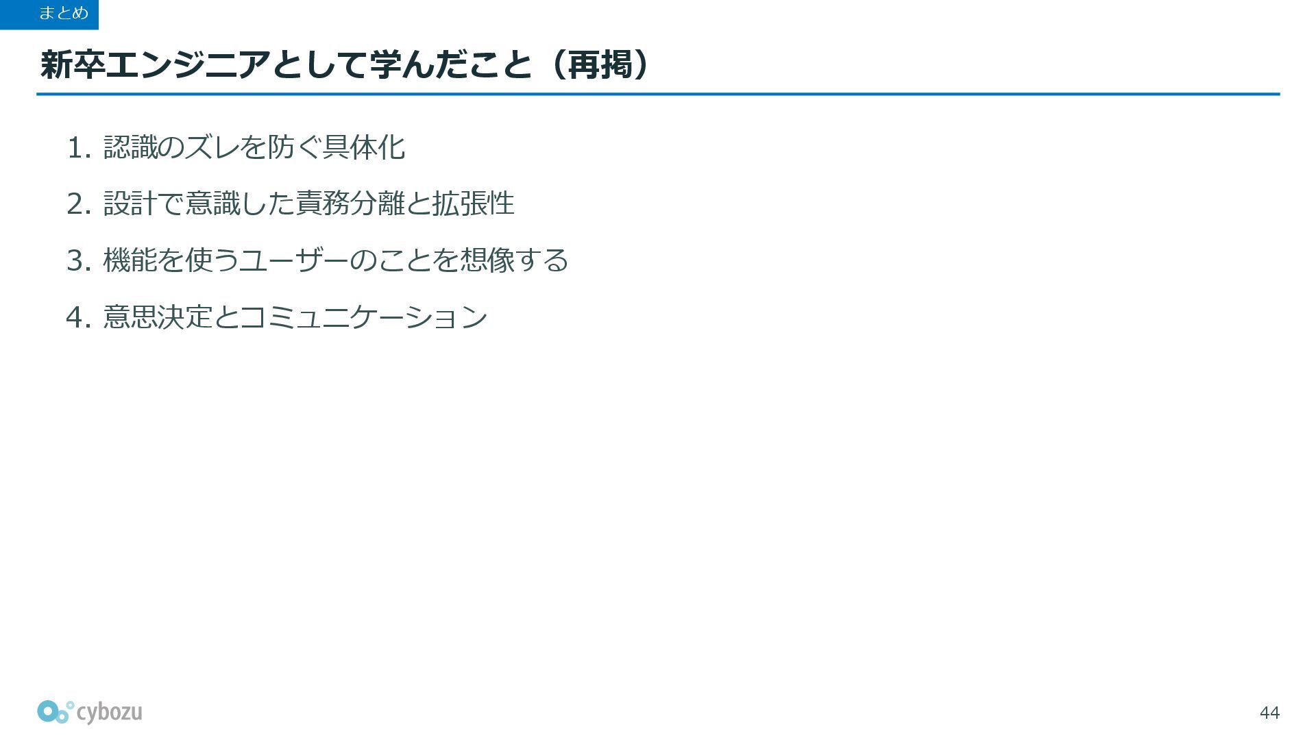 1. 認識のズレを防ぐ具体化 2. 設計で意識した責務分離と拡張性 3. 機能を使うユーザーのことを想像する 4. 意思決定とコミュニケーション 新卒エンジニアとして学んだこと(再掲) 44
