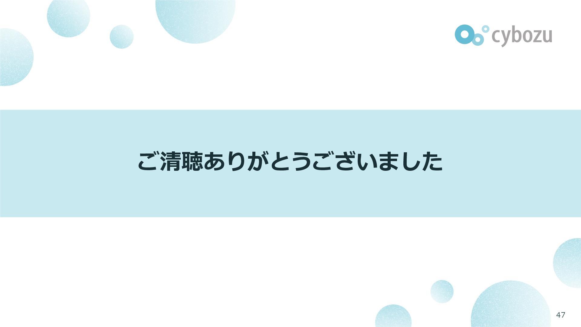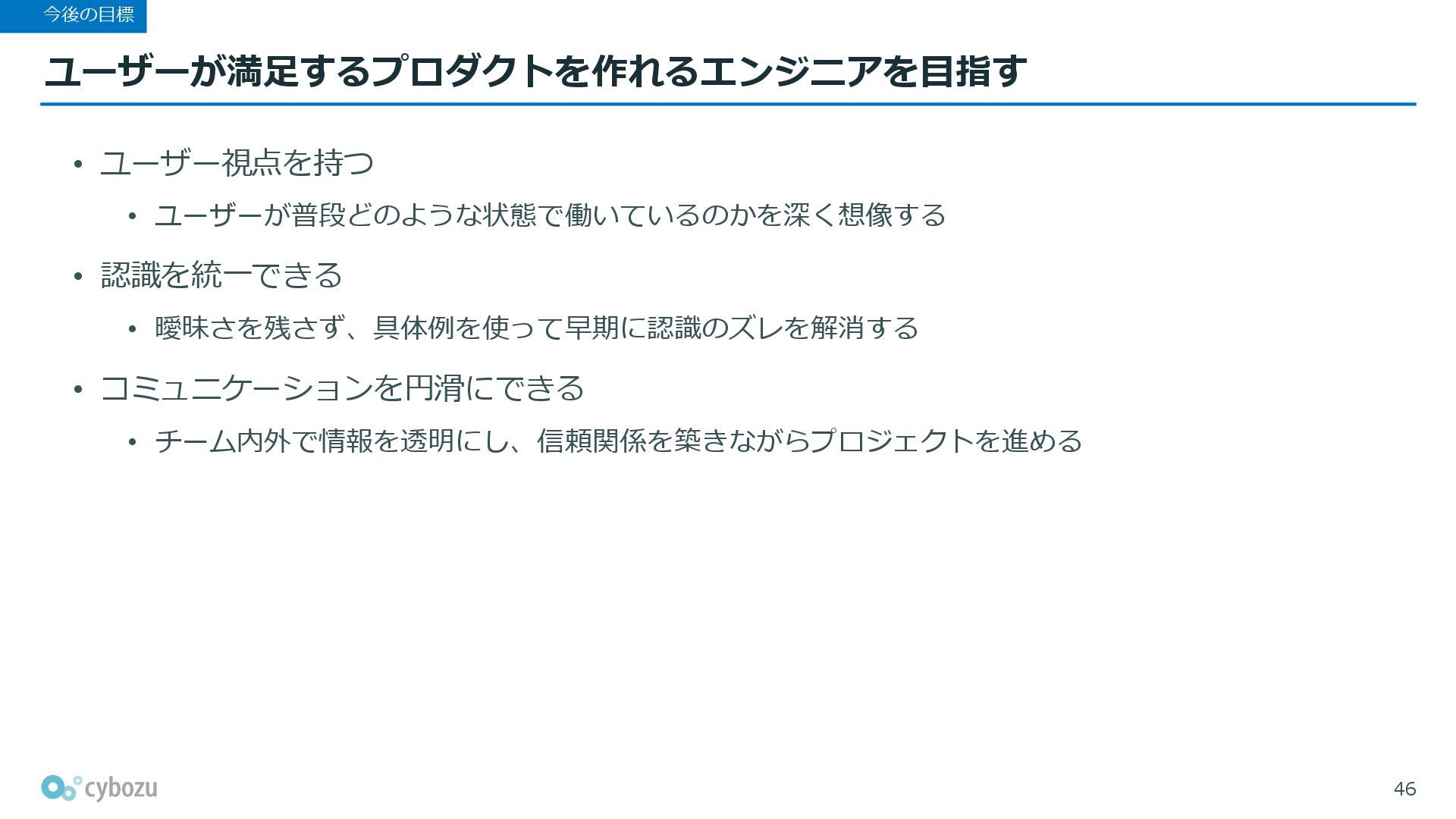 • チーム内外で情報を透明にし、信頼関係を築きながらプロジェクトを進める ユーザーが満足するプロダクトを作れるエンジニアを目指す 46 今後の目標