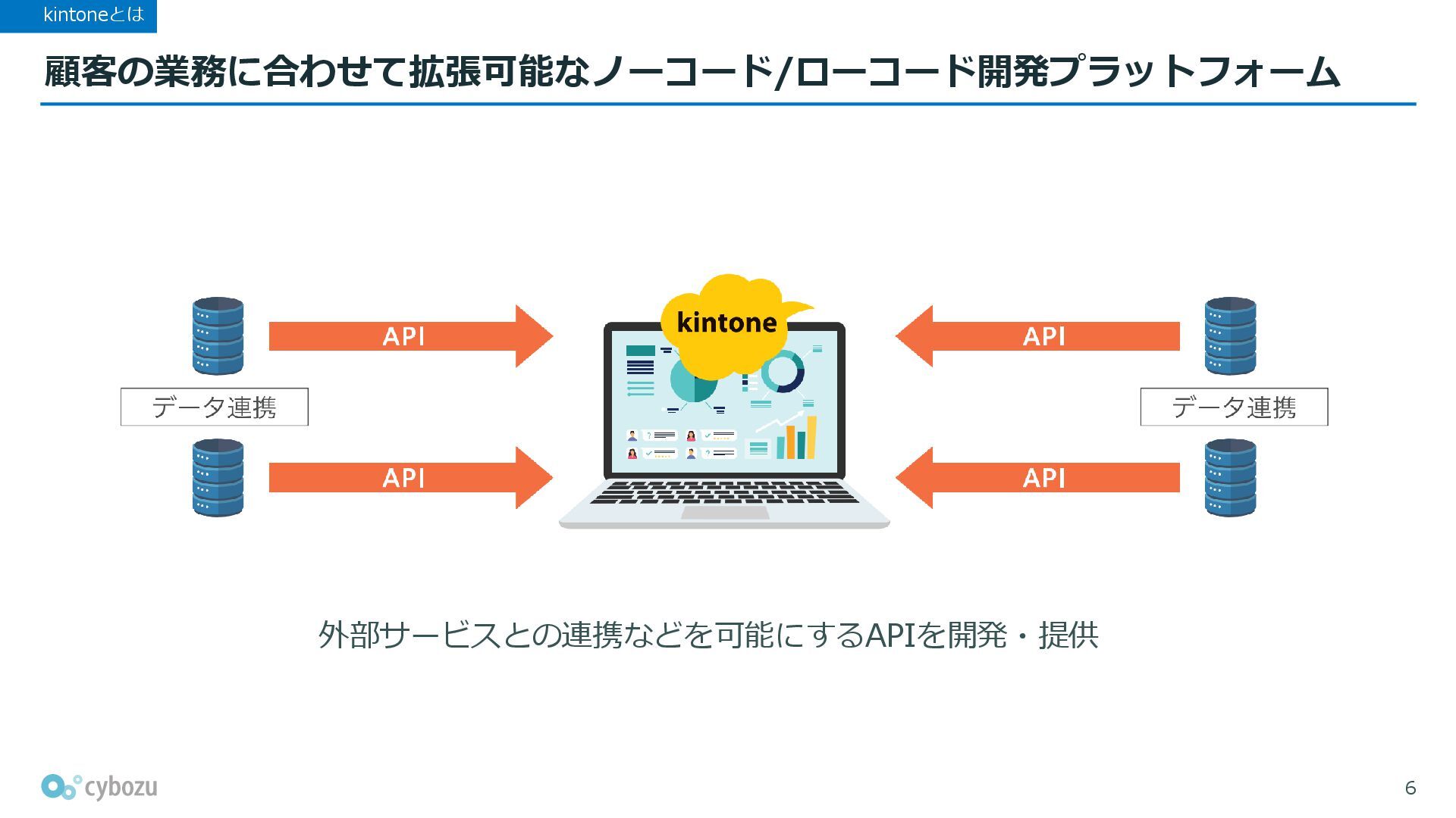 顧客の業務に合わせて拡張可能なノーコード/ローコード開発プラットフォーム 6 kintoneとは 外部サービスとの連携などを可能にするAPIを開発・提供