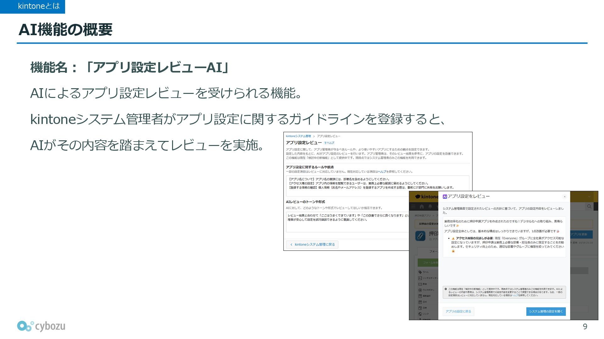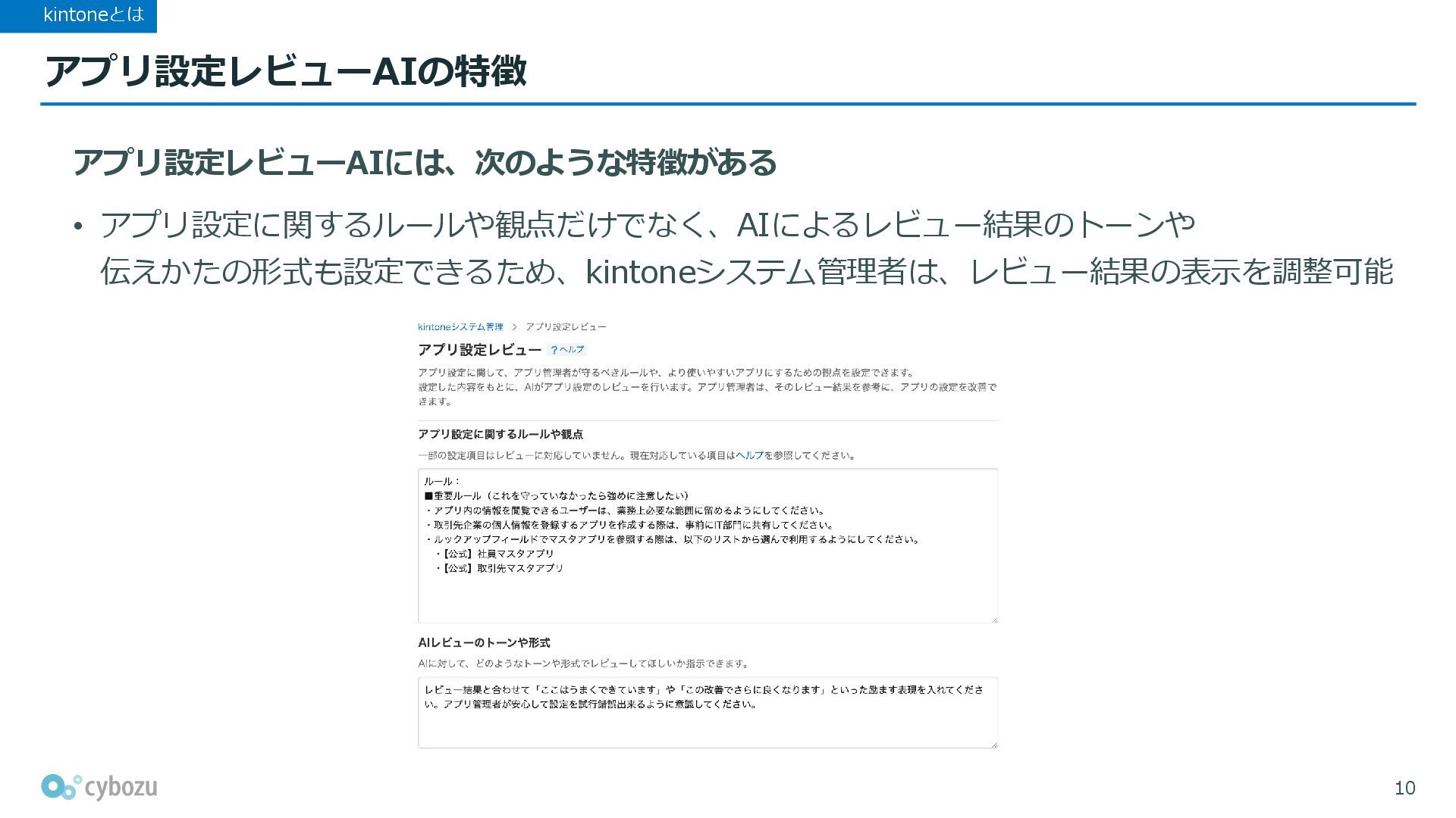 機能名:「アプリ設定レビューAI」 AIによるアプリ設定レビューを受けられる機能。 kintoneシステム管理者がアプリ設定に関するガイドラインを登録すると、 AIがその内容を踏まえてレビューを実施。 AI機能の概要 9 kintoneとは