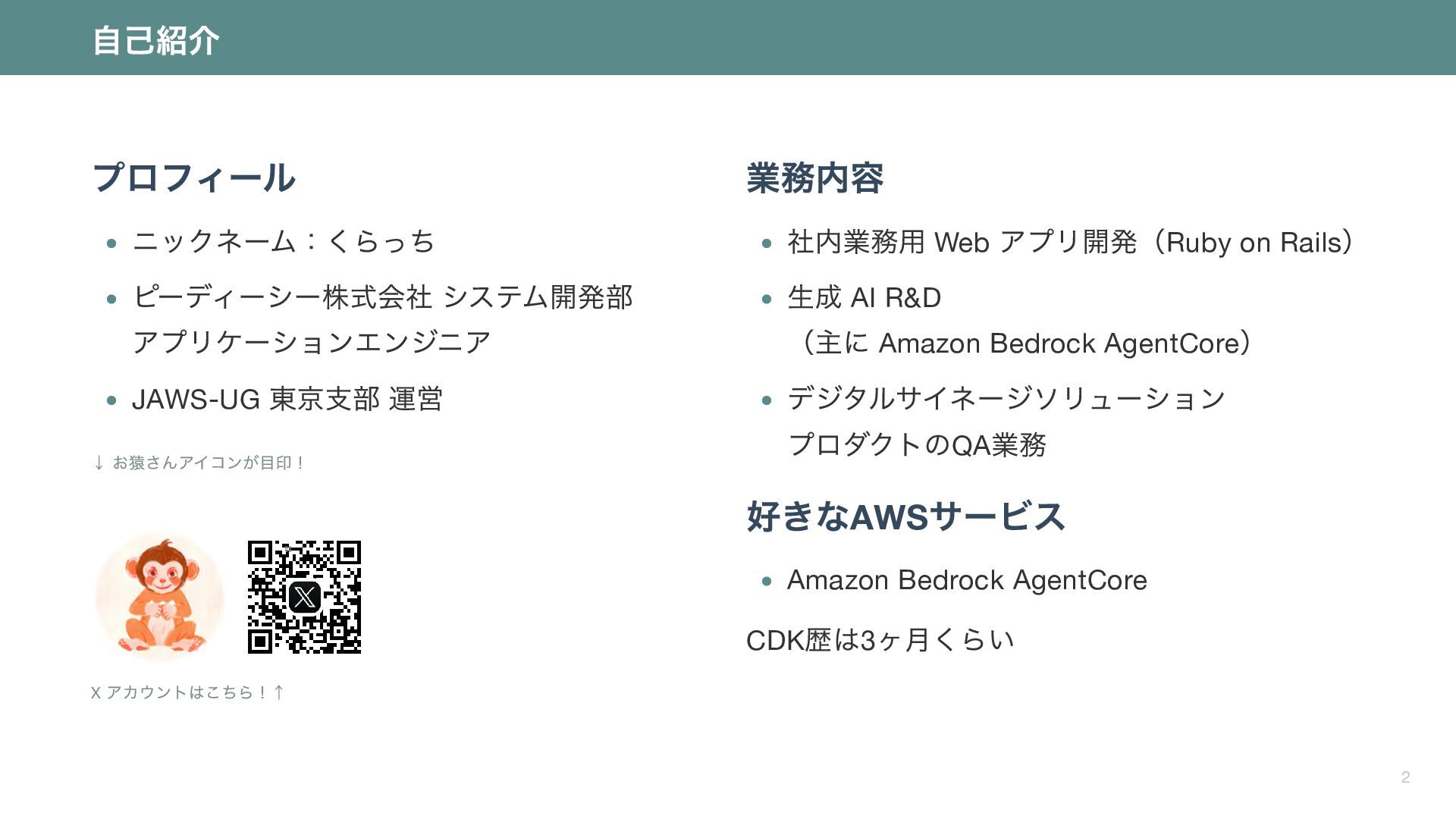 お猿さんアイコンが目印! X アカウントはこちら!↑ 業務内容 社内業務用 Web アプリ開発(Ruby on Rails ) 生成 AI R&D (主に Amazon Bedrock AgentCore ) デジタルサイネージソリューション プロダクトのQA 業務 好きなAWS サービス Amazon Bedrock AgentCore CDK 歴は3 ヶ月くらい 2