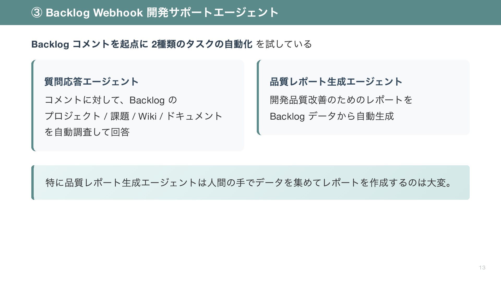 コメントに対して、Backlog の プロジェクト / 課題 / Wiki / ドキュメント を自動調査して回答 品質レポート生成エージェント 開発品質改善のためのレポートを Backlog データから自動生成 特に品質レポート生成エージェントは人間の手でデータを集めてレポートを作成するのは大変。 13