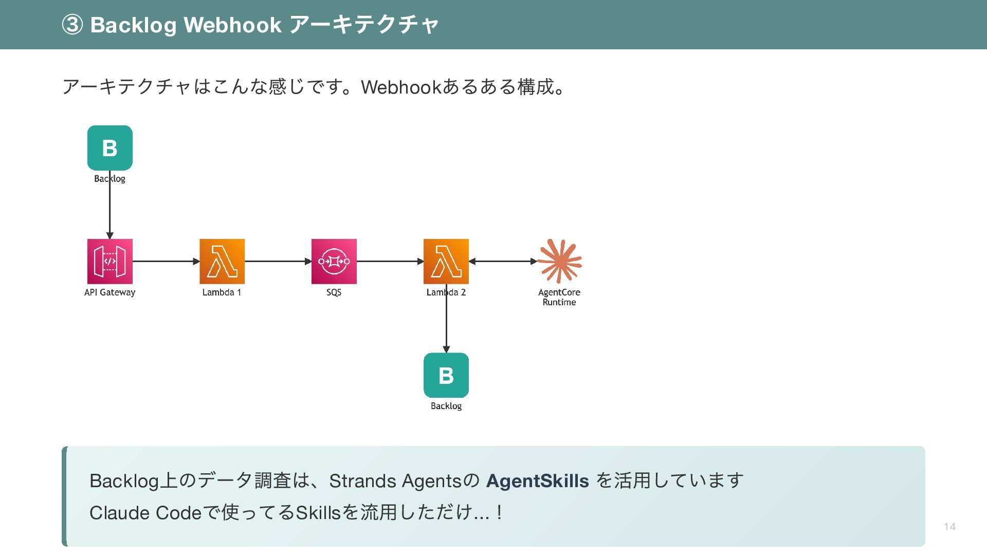 ③ Backlog Webhook アーキテクチャ アーキテクチャはこんな感じです。Webhook あるある構成。 Backlog 上のデータ調査は、Strands Agents の