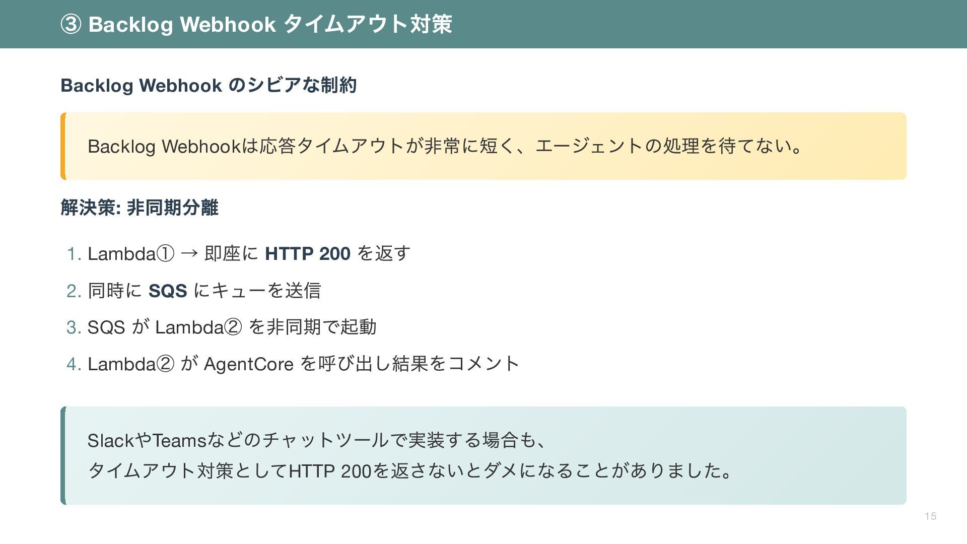 ③ Backlog Webhook タイムアウト対策 Backlog Webhook のシビアな制約 Backlog Webhook は応答タイムアウトが非常に短く、エージェントの処理を待てない。