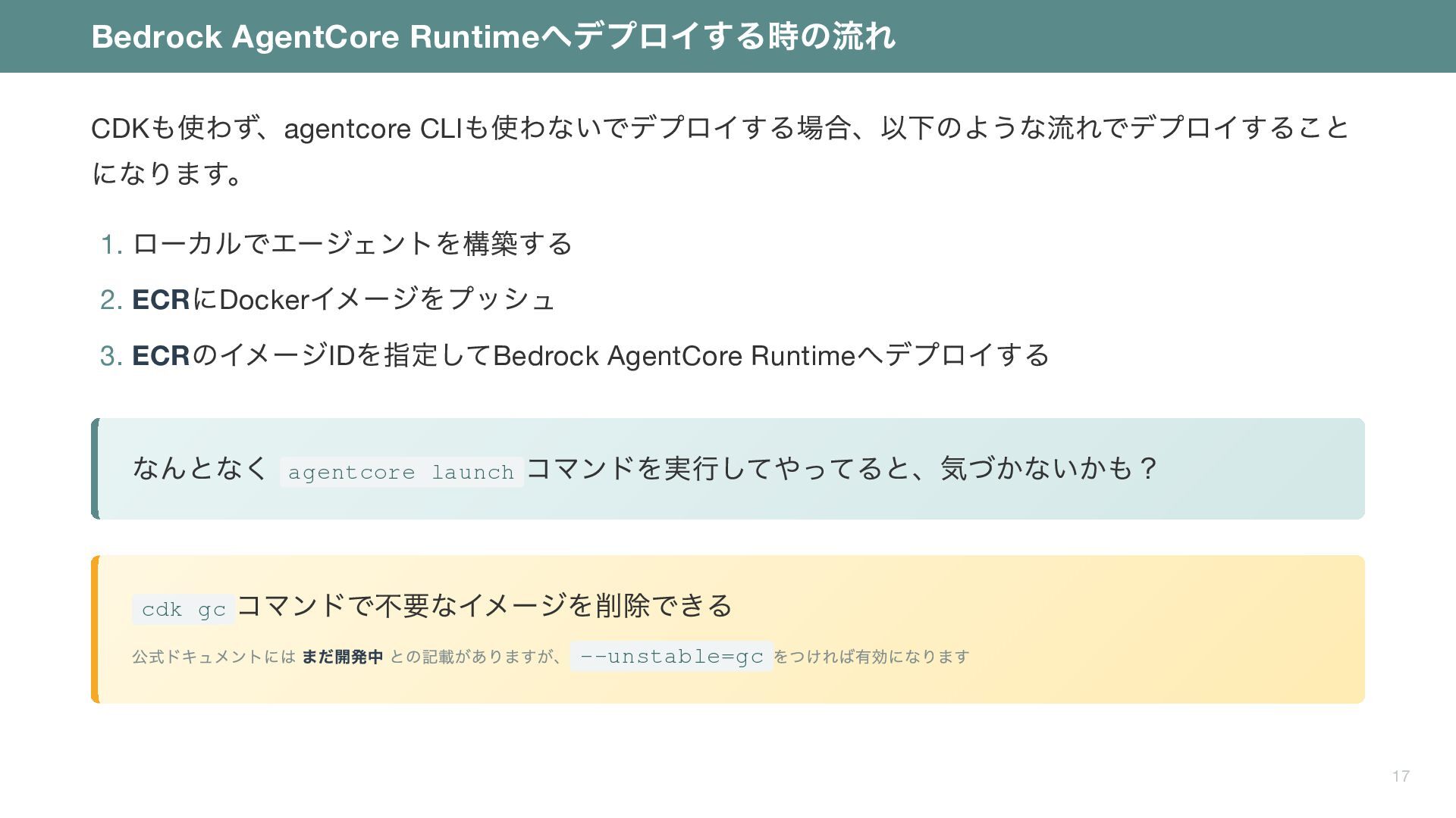 ローカルでエージェントを構築する 2. ECR にDocker イメージをプッシュ 3. ECR のイメージID を指定してBedrock AgentCore Runtime へデプロイする なんとなく agentcore launch コマンドを実行してやってると、気づかないかも? cdk gc コマンドで不要なイメージを削除できる 公式ドキュメントには まだ開発中 との記載がありますが、 --unstable=gc をつければ有効になります 17