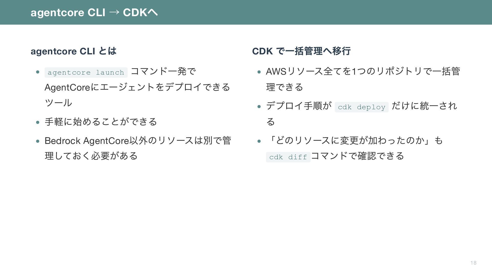 コマンド一発で AgentCore にエージェントをデプロイできる ツール 手軽に始めることができる Bedrock AgentCore 以外のリソースは別で管 理しておく必要がある CDK で一括管理へ移行 AWS リソース全てを1 つのリポジトリで一括管 理できる デプロイ手順が cdk deploy だけに統一され る 「どのリソースに変更が加わったのか」も cdk diff コマンドで確認できる 18