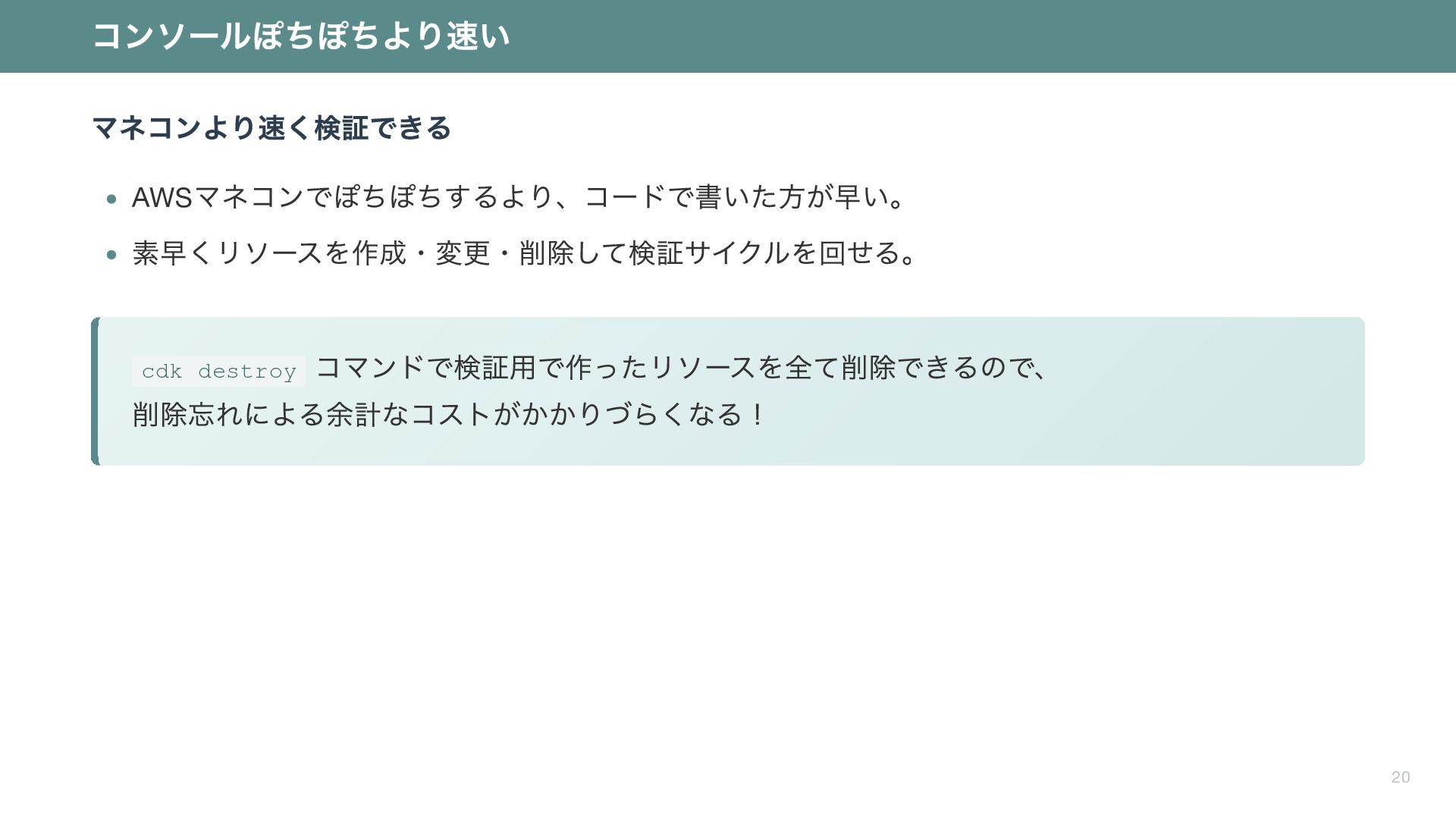 コンソールぽちぽちより速い マネコンより速く検証できる AWS マネコンでぽちぽちするより、コードで書いた方が早い。 素早くリソースを作成・変更・削除して検証サイクルを回せる。 cdk destroy コマンドで検証用で作ったリソースを全て削除できるので、 削除忘れによる余計なコストがかかりづらくなる! 20