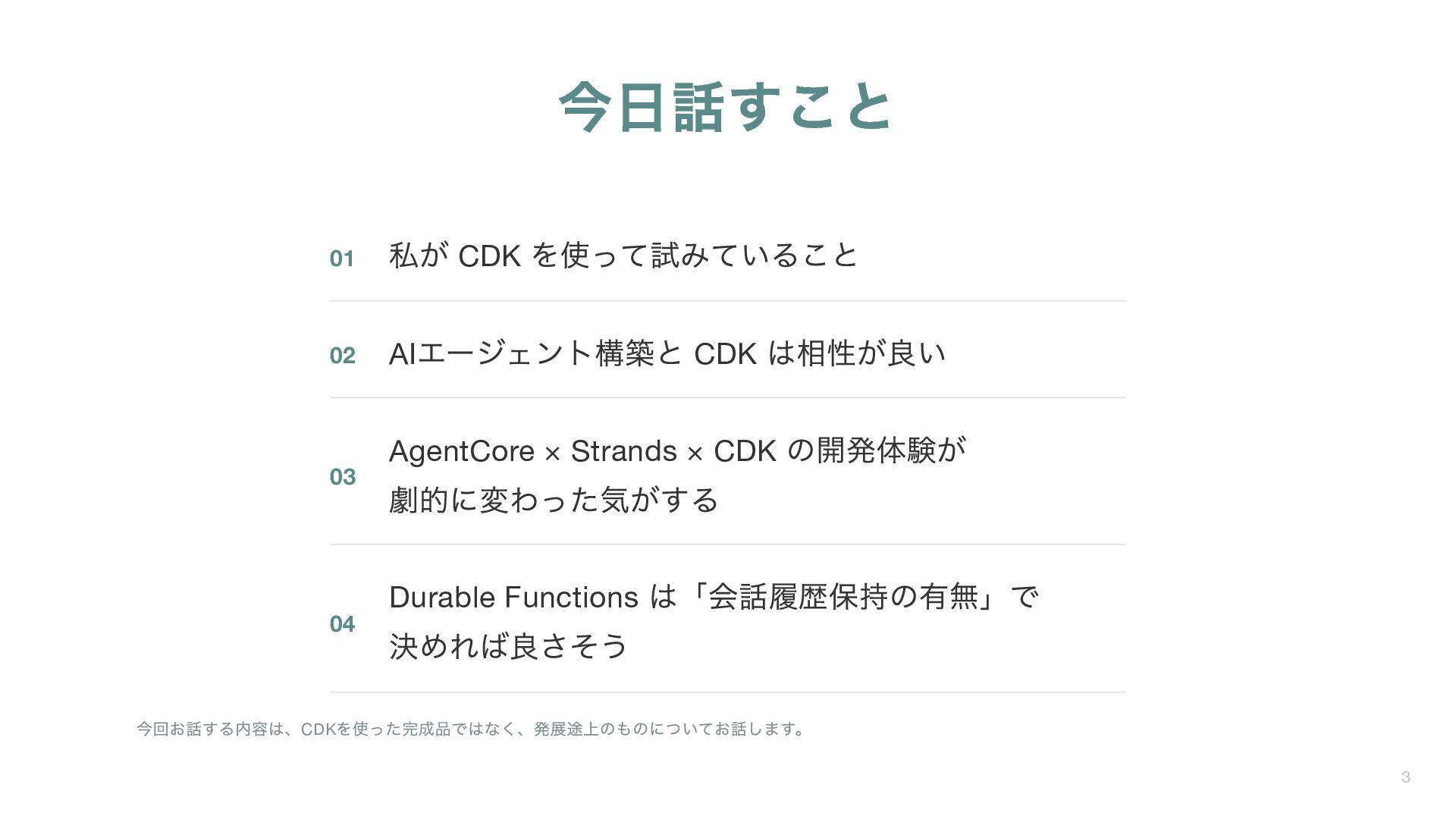 03 AgentCore × Strands × CDK の開発体験が 劇的に変わった気がする 04 Durable Functions は「会話履歴保持の有無」で 決めれば良さそう 今回お話する内容は、CDK を使った完成品ではなく、発展途上のものについてお話します。 3
