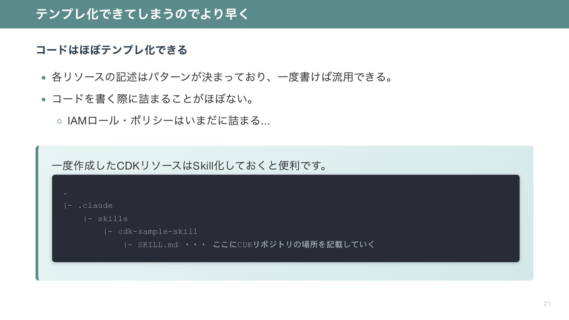|- .claude |- skills |- cdk-sample-skill |- SKILL.md ・・・ ここにCDKリポジトリの場所を記載していく 21