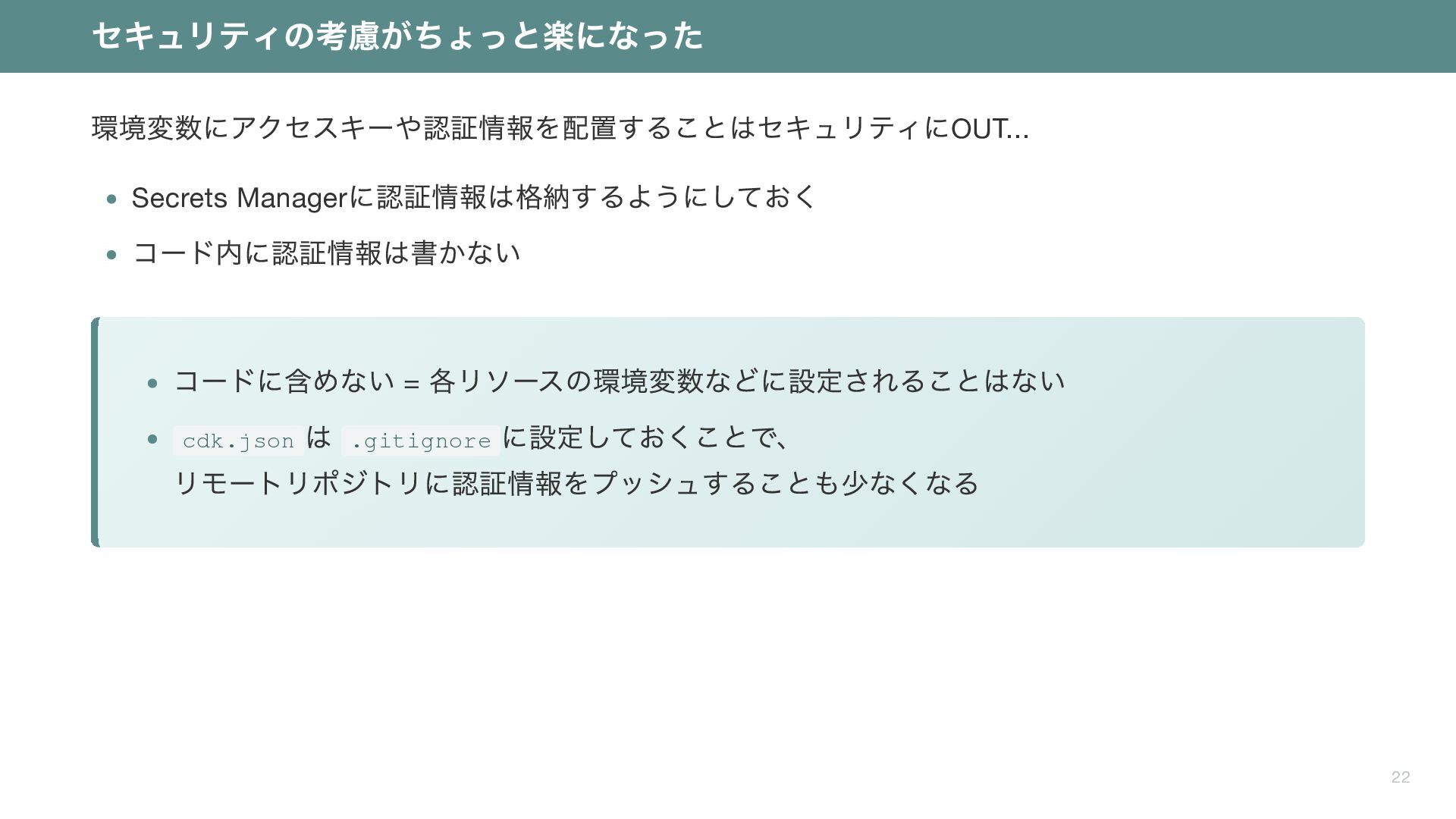 セキュリティの考慮がちょっと楽になった 環境変数にアクセスキーや認証情報を配置することはセキュリティにOUT... Secrets Manager に認証情報は格納するようにしておく コード内に認証情報は書かない コードに含めない = 各リソースの環境変数などに設定されることはない cdk.json
