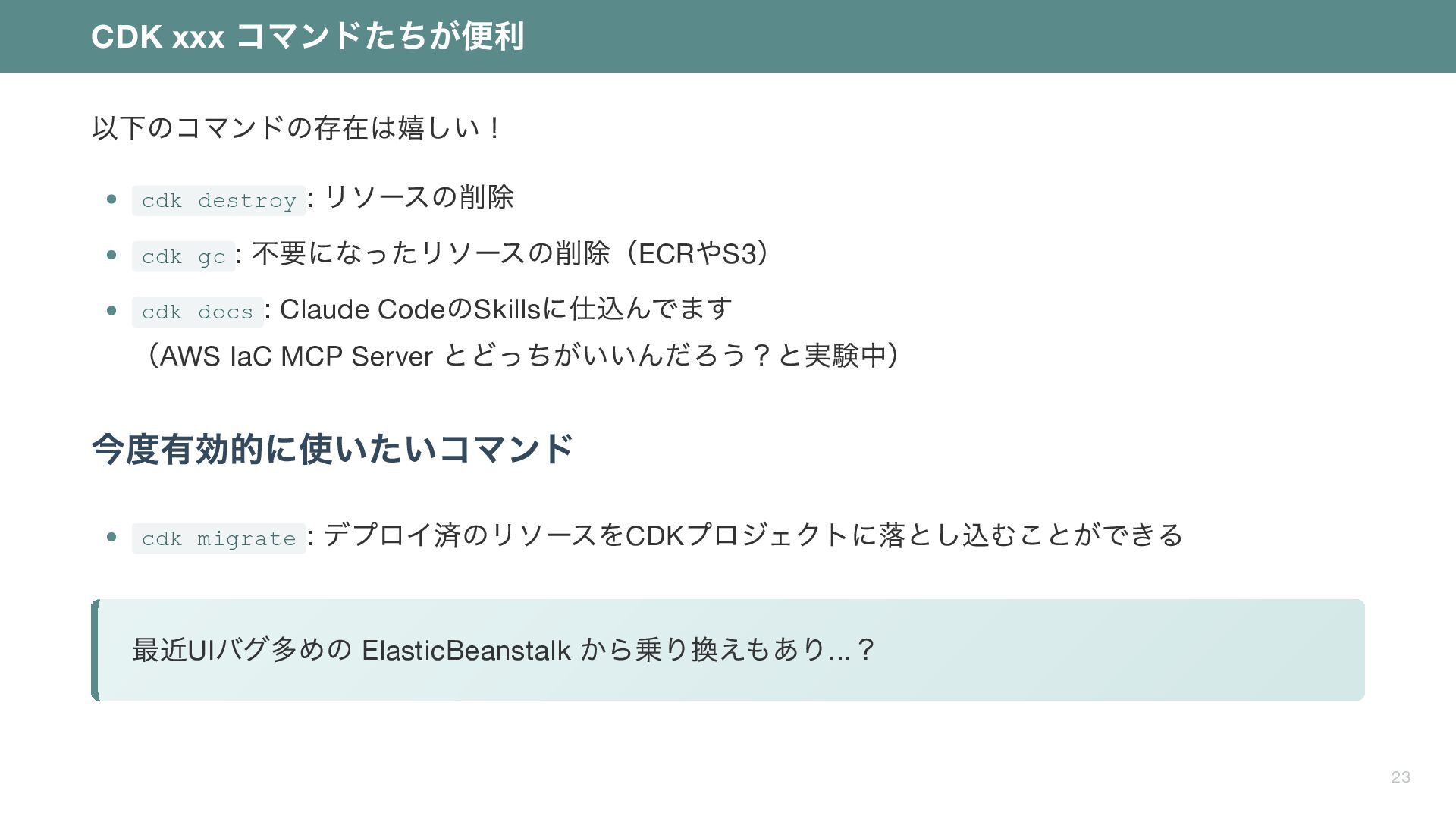 : 不要になったリソースの削除(ECR やS3 ) cdk docs : Claude Code のSkills に仕込んでます (AWS IaC MCP Server とどっちがいいんだろう?と実験中) 今度有効的に使いたいコマンド cdk migrate : デプロイ済のリソースをCDK プロジェクトに落とし込むことができる 最近UI バグ多めの ElasticBeanstalk から乗り換えもあり... ? 23