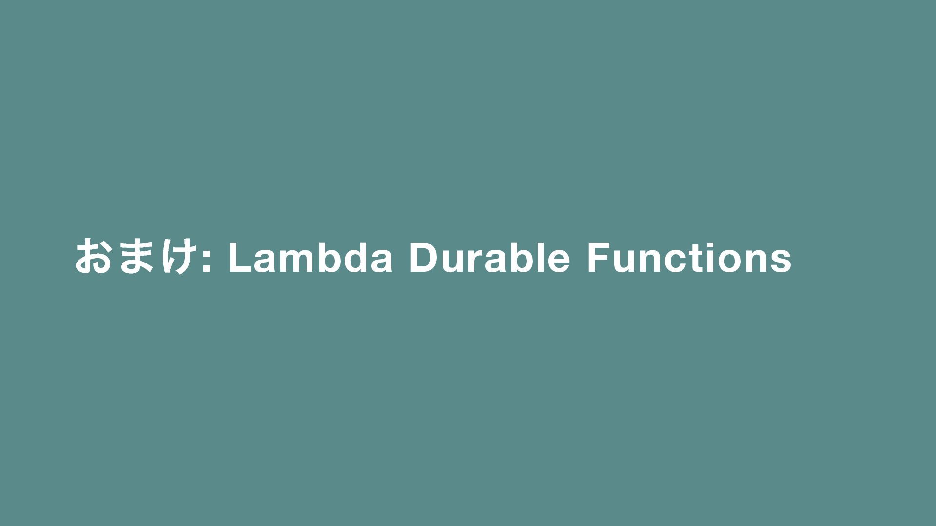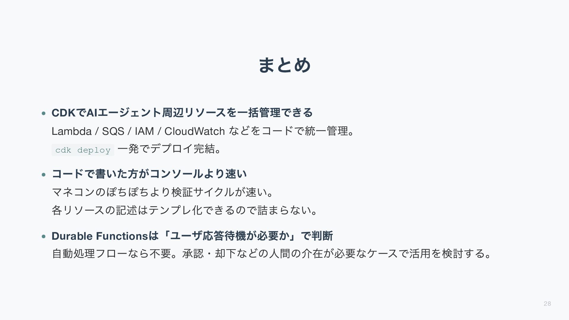 CloudWatch などをコードで統一管理。 cdk deploy 一発でデプロイ完結。 コードで書いた方がコンソールより速い マネコンのぽちぽちより検証サイクルが速い。 各リソースの記述はテンプレ化できるので詰まらない。 Durable Functions は「ユーザ応答待機が必要か」で判断 自動処理フローなら不要。承認・却下などの人間の介在が必要なケースで活用を検討する。 28