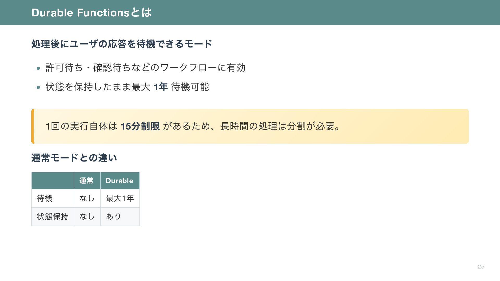 回の実行自体は 15 分制限 があるため、長時間の処理は分割が必要。 通常モードとの違い 通常 Durable 待機 なし 最大1 年 状態保持 なし あり 25
