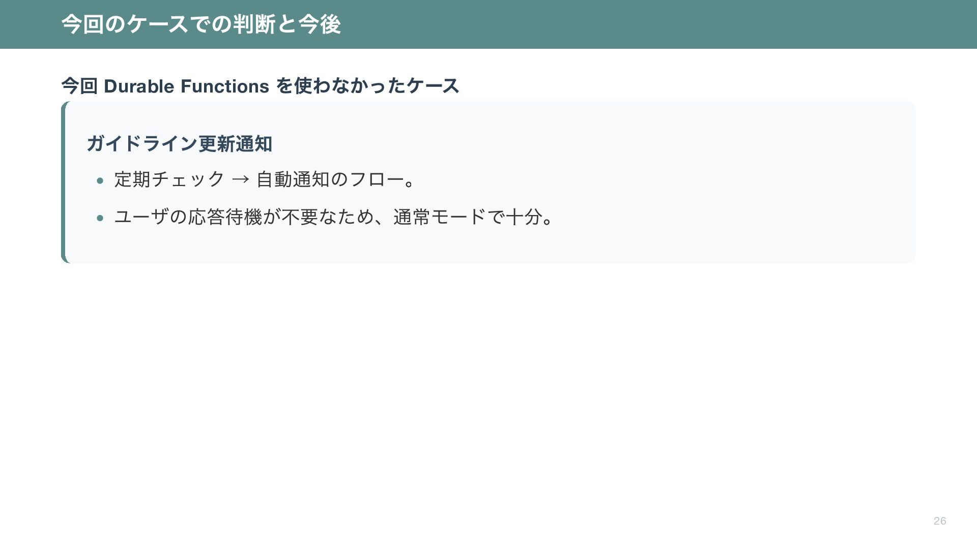 今回のケースでの判断と今後 今回 Durable Functions を使わなかったケース ガイドライン更新通知 定期チェック → 自動通知のフロー。 ユーザの応答待機が不要なため、通常モードで十分。