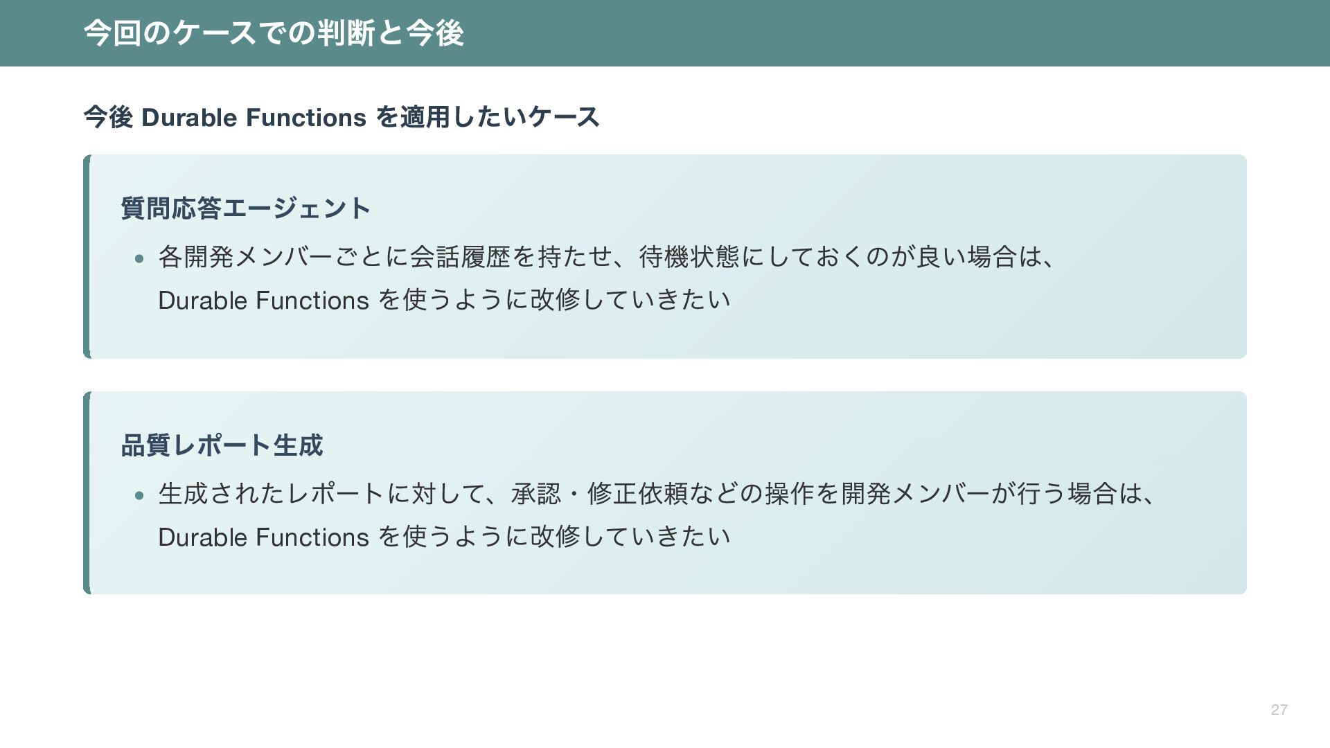 今回のケースでの判断と今後 今後 Durable Functions を適用したいケース 質問応答エージェント 各開発メンバーごとに会話履歴を持たせ、待機状態にしておくのが良い場合は、 Durable Functions を使うように改修していきたい