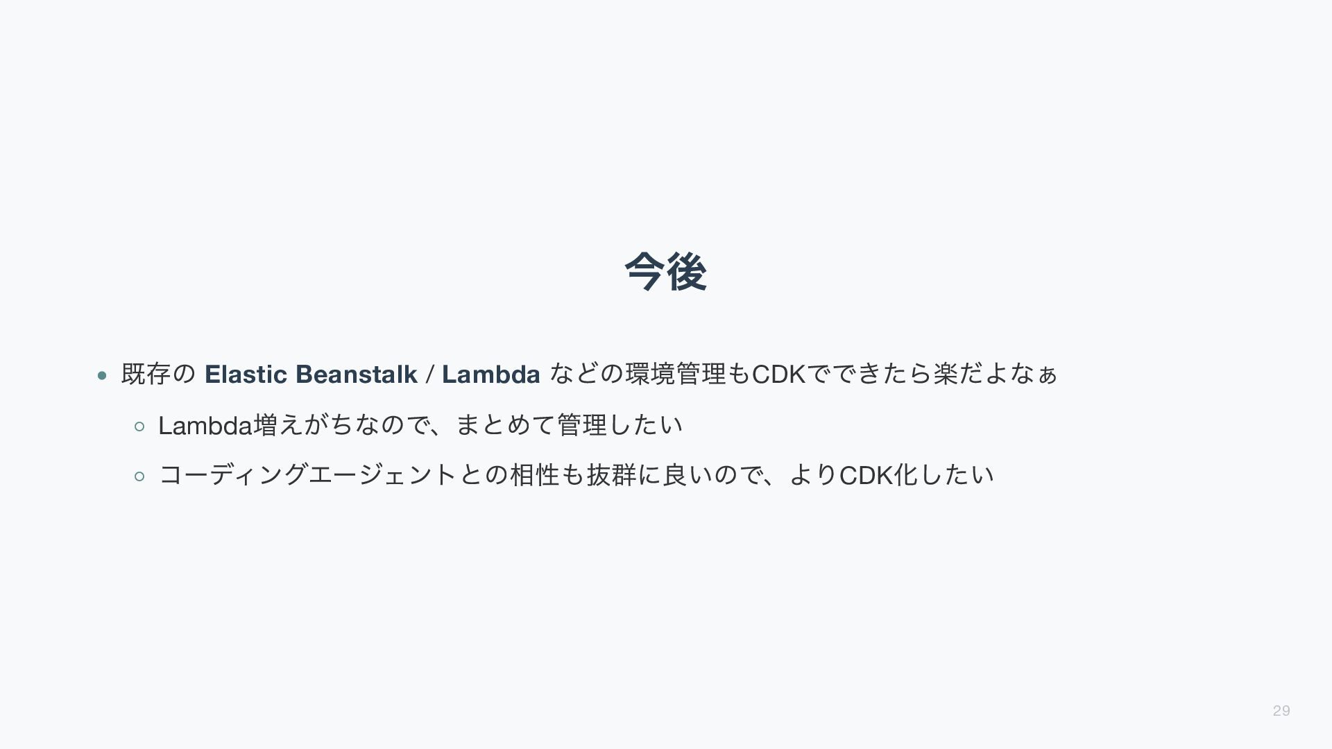 コーディングエージェントとの相性も抜群に良いので、よりCDK 化したい 29