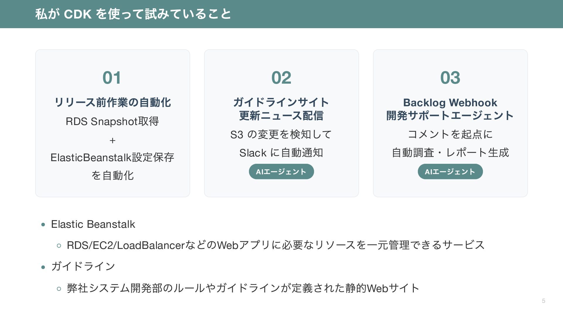 今日話すこと 01 私が CDK を使って試みていること 02 AI エージェント構築と CDK は相性が良い