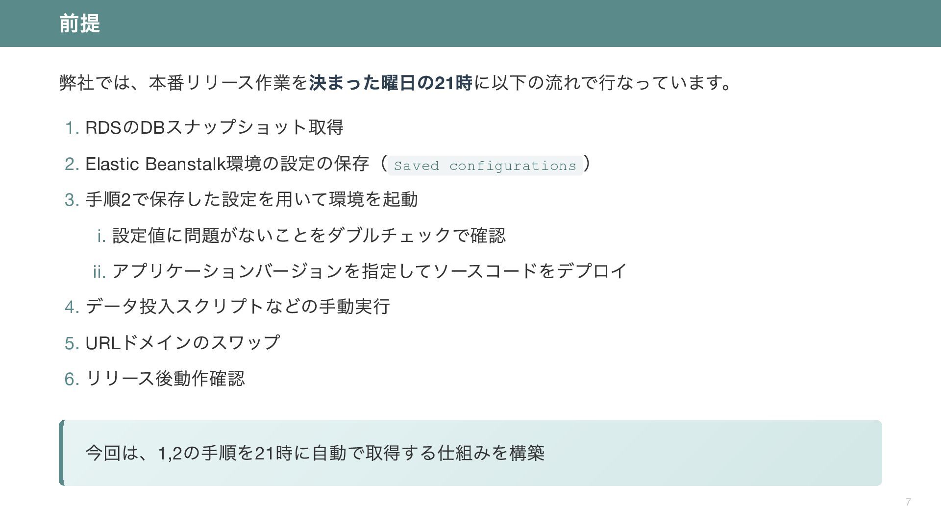 環境の設定の保存( Saved configurations ) 3. 手順2 で保存した設定を用いて環境を起動 i. 設定値に問題がないことをダブルチェックで確認 ii. アプリケーションバージョンを指定してソースコードをデプロイ 4. データ投入スクリプトなどの手動実行 5. URL ドメインのスワップ 6. リリース後動作確認 今回は、1,2 の手順を21 時に自動で取得する仕組みを構築 7