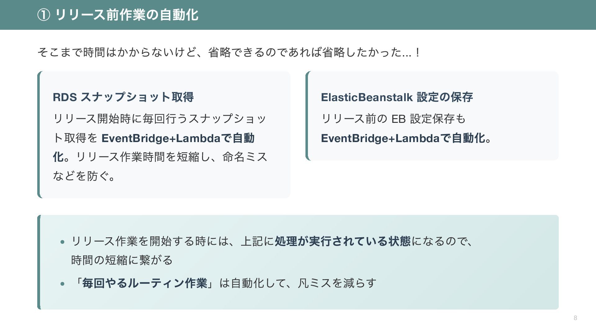 ① リリース前作業の自動化 そこまで時間はかからないけど、省略できるのであれば省略したかった... ! RDS スナップショット取得 リリース開始時に毎回行うスナップショッ ト取得を EventBridge+Lambda で自動