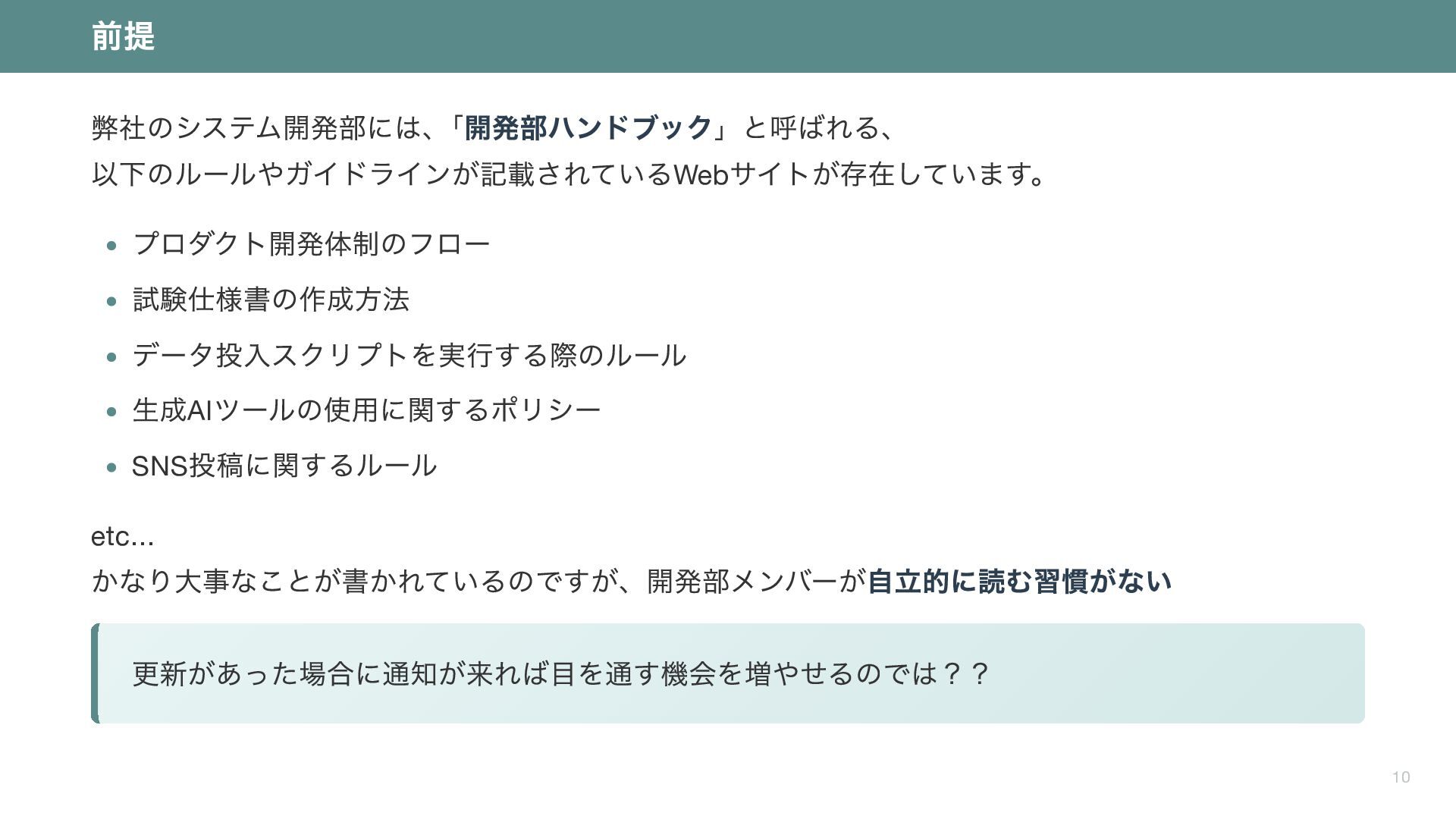 前提 弊社のシステム開発部には、 「開発部ハンドブック」と呼ばれる、 以下のルールやガイドラインが記載されているWeb サイトが存在しています。 プロダクト開発体制のフロー 試験仕様書の作成方法 データ投入スクリプトを実行する際のルール 生成AI ツールの使用に関するポリシー