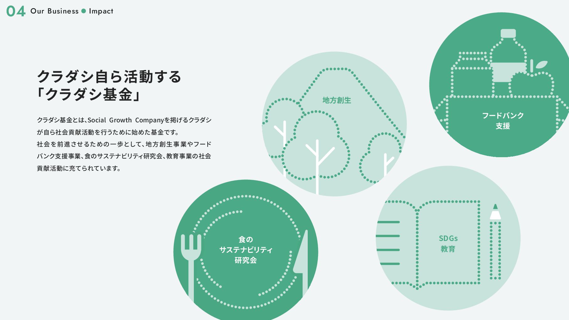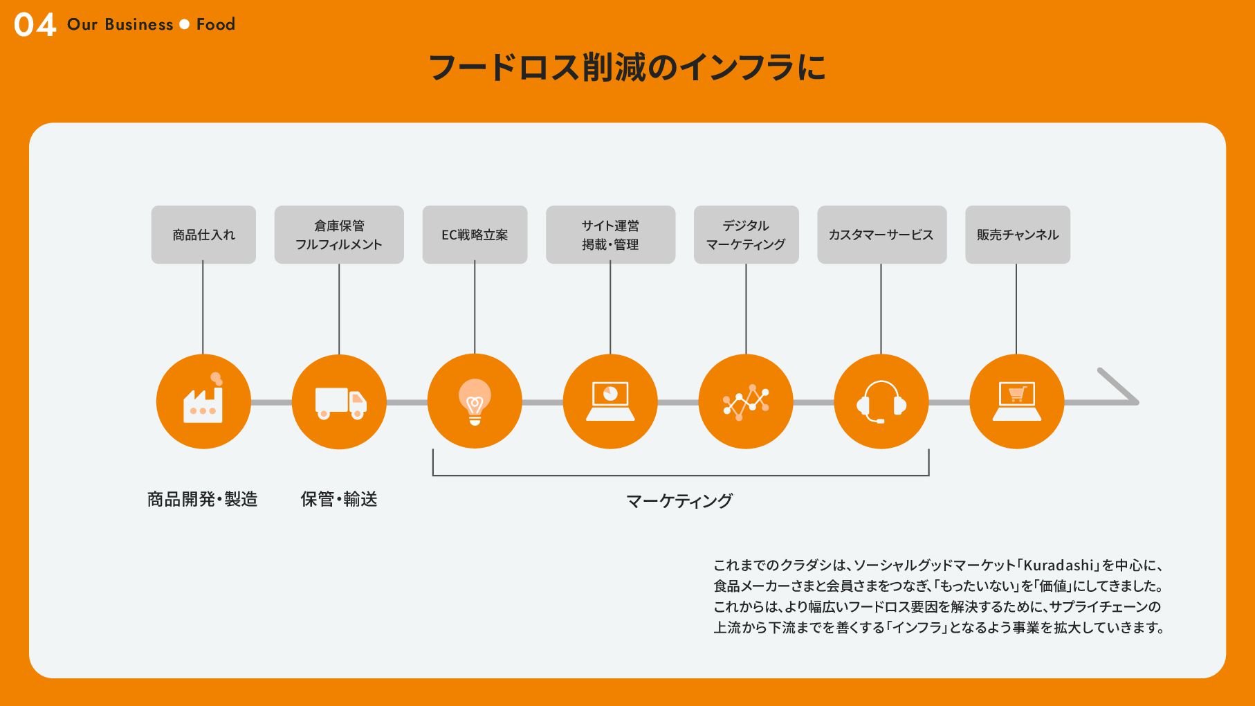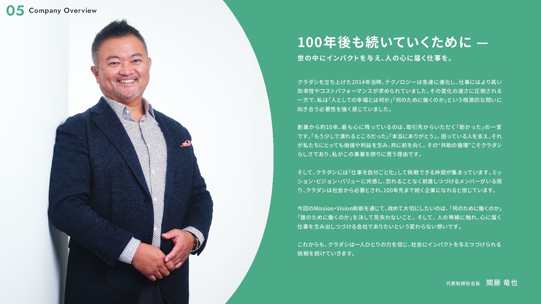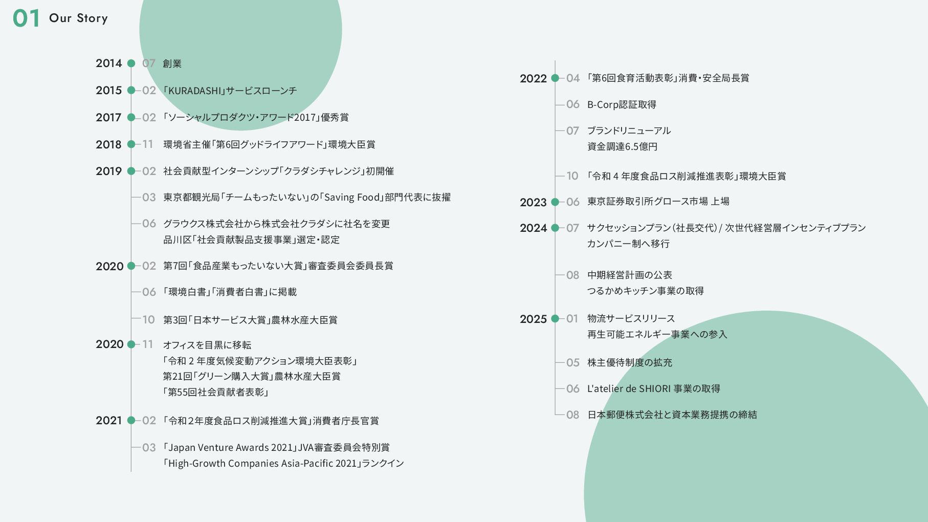 アワード2017」 優秀賞 2017 11 環境省主催 「第6回グッ ドライフアワード」 環境大臣賞 2018 02 社会貢献型インターンシップ 「クラダシチャレンジ」 初開催 2019 03 東京都観光局 「チームもったいない」 の 「Saving Food」 部門代表に抜擢 02 第7回 「食品産業もったいない大賞」 審査委員会委員長賞 06 「環境白書」 「消費者白書」 に掲載 10 第3回 「日本サービス大賞」 農林水産大臣賞 2020 06 グラウクス株式会社から株式会社クラダシに社名を変更 品川区 「社会貢献製品支援事業」 選定 ・ 認定 2020 11 オフィスを目黒に移転 「令和 2 年度気候変動アクション環境大臣表彰」 第21回 「グリーン購入大賞」 農林水産大臣賞 「第55回社会貢献者表彰」 02 「令和2年度食品ロス削減推進大賞」 消費者庁長官賞 2021 03 「Japan Venture Awards 2021」 JVA審査委員会特別賞 「High-Growth Companies Asia-Pacific 2021」 ランクイン 04 「第6回食育活動表彰」 消費 ・ 安全局長賞 06 2022 B-Corp認証取得 02 「令和2年度食品ロス削減推進大賞」 消費者庁長官賞 2021 03 「Japan Venture Awards 2021」 JVA審査委員会特別賞 「High-Growth Companies Asia-Pacific 2021」 ランクイン 04 「第6回食育活動表彰」 消費 ・ 安全局長賞 06 07 ブランドリニューアル 資金調達6.5億円 2022 07 サクセッションプラン (社長交代) / 次世代経営層インセンティ ブプラン カンパニー制へ移行 2024 01 05 06 08 物流サービスリリース 再生可能エネルギー事業への参入 2025 株主優待制度の拡充 L'atelier de SHIORI 事業の取得 日本郵便株式会社と資本業務提携の締結 08 中期経営計画の公表 つるかめキッチン事業の取得 B-Corp認証取得 10 06 「令和 4 年度食品ロス削減推進表彰」 環境大臣賞 東京証券取引所グロース市場 上場 2023 Our Story 01