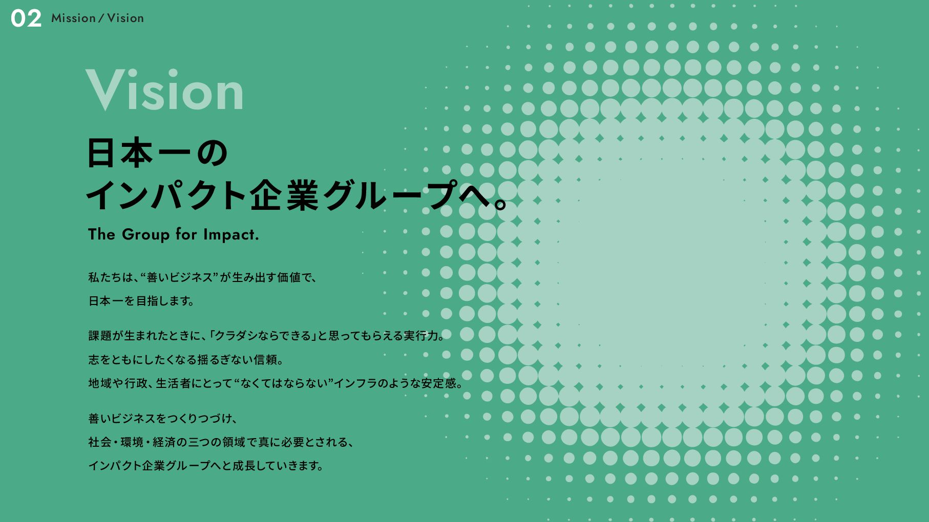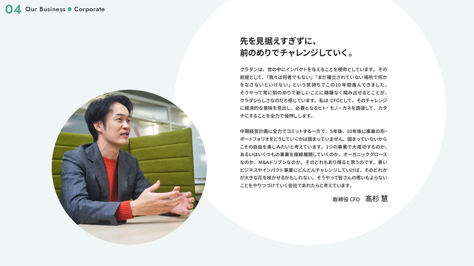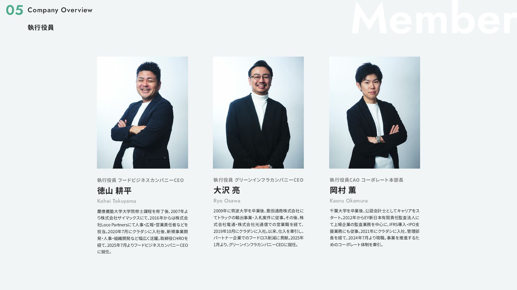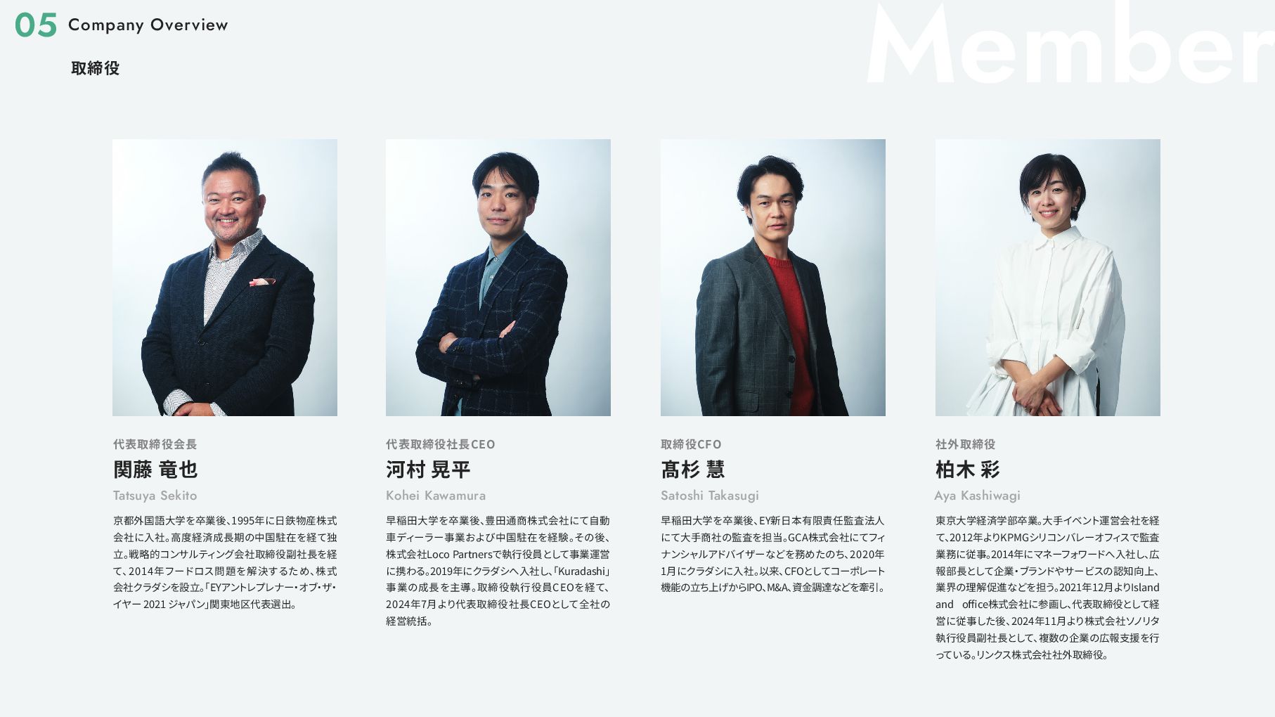 アワード2017」 優秀賞 2017 11 環境省主催 「第6回グッ ドライフアワード」 環境大臣賞 2018 02 社会貢献型インターンシップ 「クラダシチャレンジ」 初開催 2019 03 東京都観光局 「チームもったいない」 の 「Saving Food」 部門代表に抜擢 02 第7回 「食品産業もったいない大賞」 審査委員会委員長賞 06 「環境白書」 「消費者白書」 に掲載 10 第3回 「日本サービス大賞」 農林水産大臣賞 2020 06 グラウクス株式会社から株式会社クラダシに社名を変更 品川区 「社会貢献製品支援事業」 選定 ・ 認定 2020 11 オフィスを目黒に移転 「令和 2 年度気候変動アクション環境大臣表彰」 第21回 「グリーン購入大賞」 農林水産大臣賞 「第55回社会貢献者表彰」 02 「令和2年度食品ロス削減推進大賞」 消費者庁長官賞 2021 03 「Japan Venture Awards 2021」 JVA審査委員会特別賞 「High-Growth Companies Asia-Pacific 2021」 ランクイン 04 「第6回食育活動表彰」 消費 ・ 安全局長賞 06 2022 B-Corp認証取得 02 「令和2年度食品ロス削減推進大賞」 消費者庁長官賞 2021 03 「Japan Venture Awards 2021」 JVA審査委員会特別賞 「High-Growth Companies Asia-Pacific 2021」 ランクイン 04 「第6回食育活動表彰」 消費 ・ 安全局長賞 06 07 ブランドリニューアル 資金調達6.5億円 2022 07 サクセッションプラン (社長交代) / 次世代経営層インセンティ ブプラン カンパニー制へ移行 2024 01 05 06 08 物流サービスリリース 再生可能エネルギー事業への参入 2025 株主優待制度の拡充 L'atelier de SHIORI 事業の取得 日本郵便株式会社と資本業務提携の締結 08 中期経営計画の公表 つるかめキッチン事業の取得 B-Corp認証取得 10 06 「令和 4 年度食品ロス削減推進表彰」 環境大臣賞 東京証券取引所グロース市場 上場 2023 Our Story 01