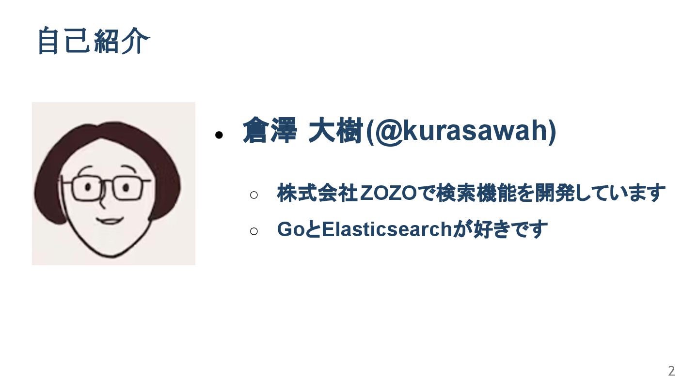 ⾃⼰紹介 • 倉澤 大樹(@kurasawah) ◦ 株式会社ZOZOで検索機能を開発しています ◦ GoとElasticsearchが好きです 2