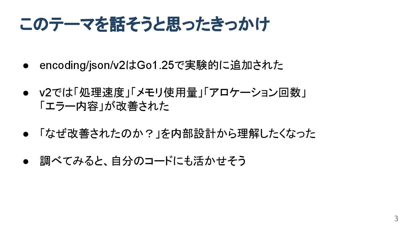 このテーマを話そうと思ったきっかけ • encoding/json/v2はGo1.25で実験的に追加された • v2では「処理速度」「メモリ使用量」「アロケーション回数」 「エラー内容」が改善された • 「なぜ改善されたのか?」を内部設計から理解したくなった • 調べてみると、自分のコードにも活かせそう