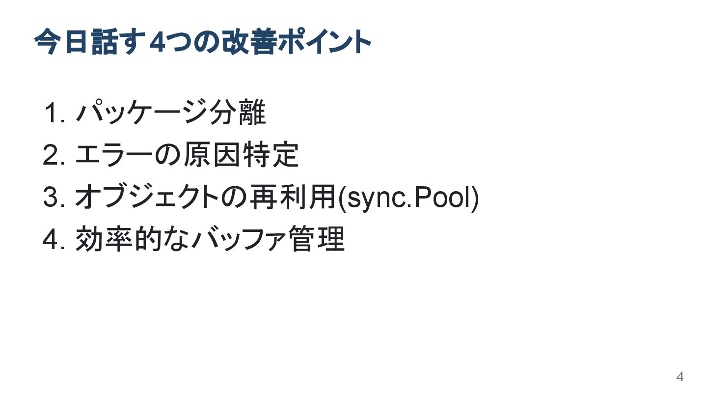 今日話す4つの改善ポイント 1. パッケージ分離 2. エラーの原因特定 3. オブジェクトの再利用(sync.Pool) 4. 効率的なバッファ管理 4