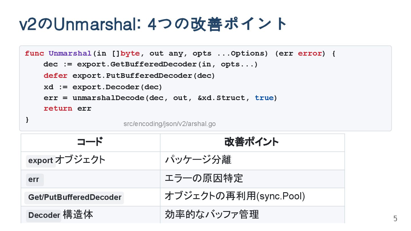 (err error) { dec := export.GetBufferedDecoder(in, opts...) defer export.PutBufferedDecoder(dec) xd := export.Decoder(dec) err = unmarshalDecode(dec, out, &xd.Struct, true) return err } コード 改善ポイント export オブジェクト パッケージ分離 err エラーの原因特定 Get/PutBufferedDecoder オブジェクトの再利用(sync.Pool) Decoder 構造体 効率的なバッファ管理 src/encoding/json/v2/arshal.go