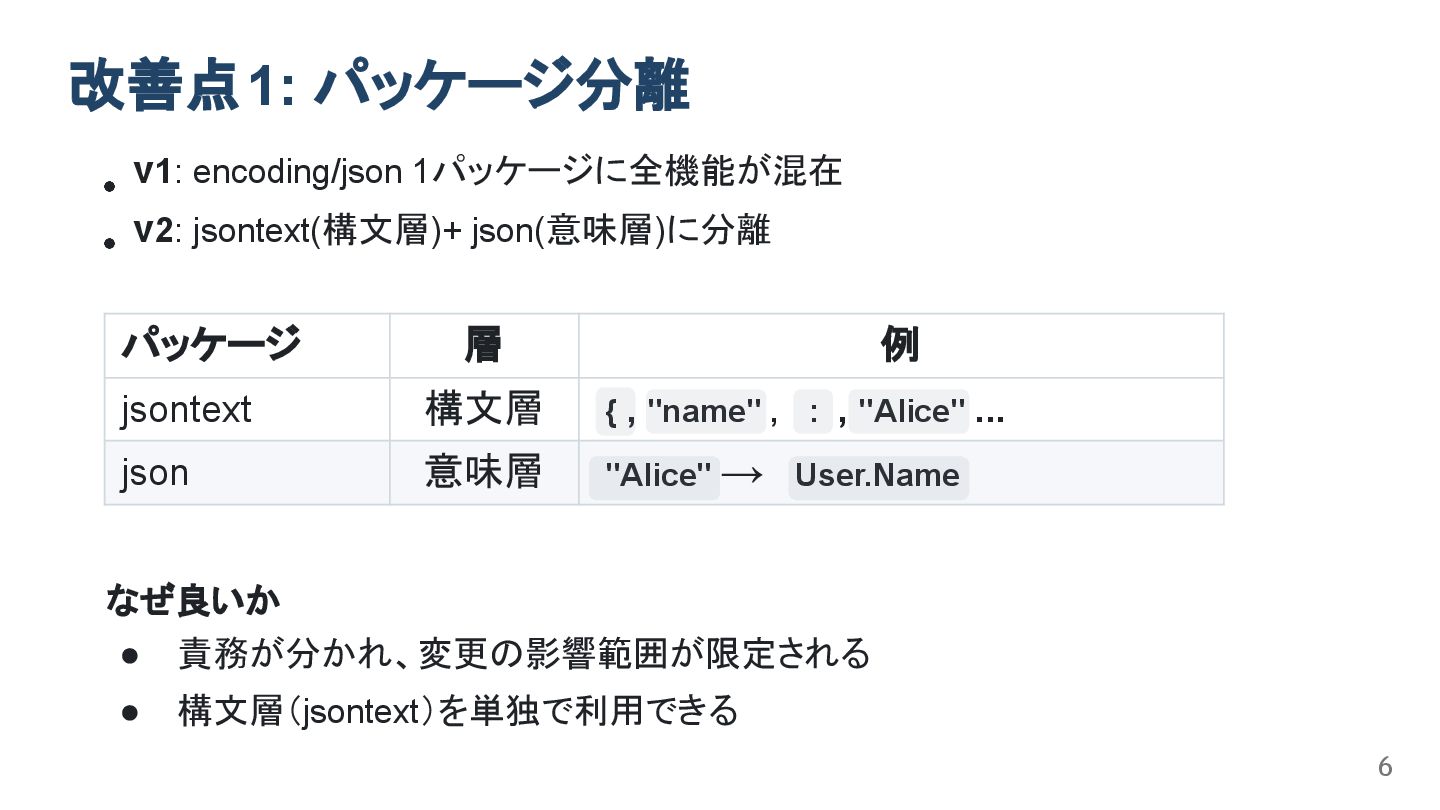 改善点1: パッケージ分離 v1: encoding/json 1パッケージに全機能が混在 v2: jsontext(構文層)+ json(意味層)に分離 パッケージ 層