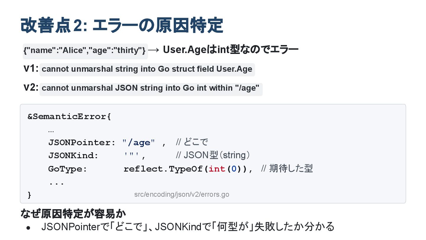 field User.Age v2: cannot unmarshal JSON string into Go int within "/age" 改善点2: エラーの原因特定 なぜ原因特定が容易か • JSONPointerで「どこで」、JSONKindで「何型が」失敗したか分かる &SemanticError{ … JSONPointer: "/age" , // どこで JSONKind: '"', // JSON型(string) GoType: reflect.TypeOf(int(0)), // 期待した型 ... } src/encoding/json/v2/errors.go