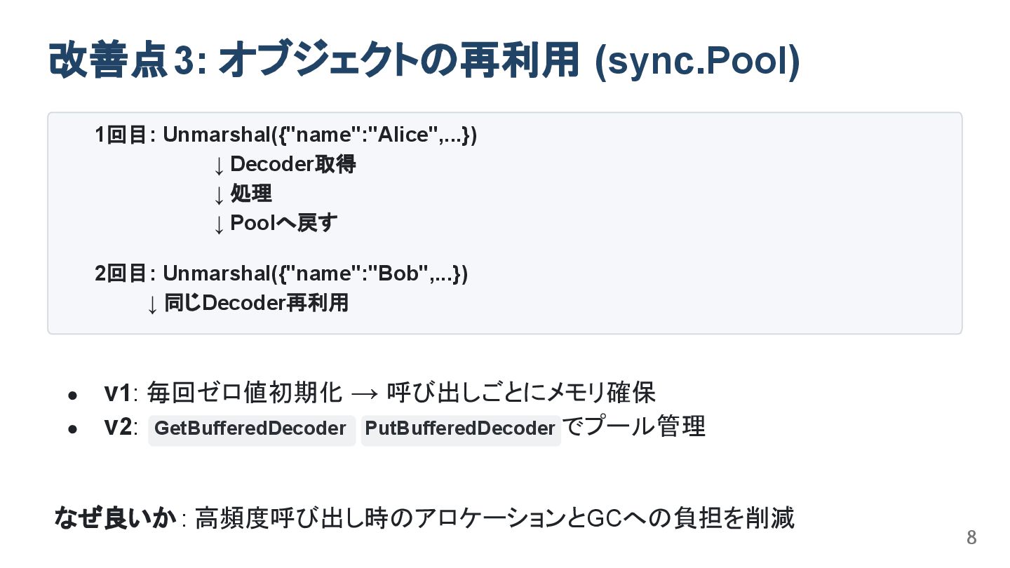 なぜ良いか : 高頻度呼び出し時のアロケーションとGCへの負担を削減 改善点3: オブジェクトの再利用 (sync.Pool) 1回目: Unmarshal({"name":"Alice",...}) ↓ Decoder取得 ↓ 処理 ↓ Poolへ戻す 2回目: Unmarshal({"name":"Bob",...}) ↓ 同じDecoder再利用 8