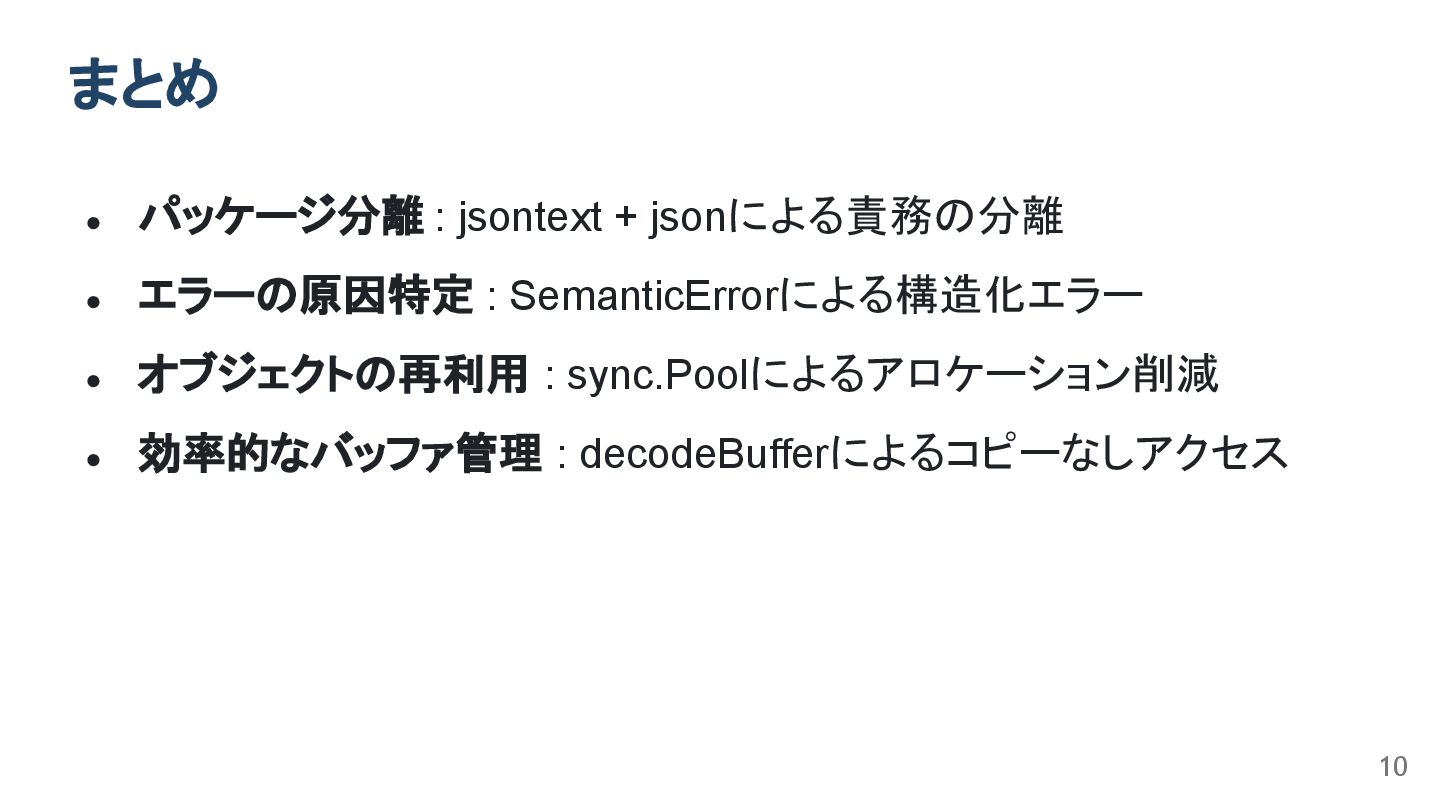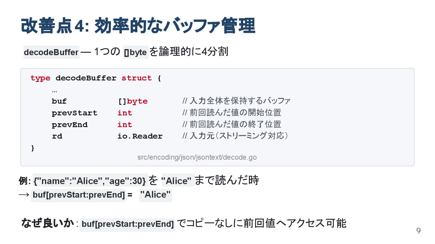 buf[prevStart:prevEnd] = "Alice" decodeBuffer — 1つの []byte を論理的に4分割 改善点4: 効率的なバッファ管理 9 type decodeBuffer struct { … buf []byte // 入力全体を保持するバッファ prevStart int // 前回読んだ値の開始位置 prevEnd int // 前回読んだ値の終了位置 rd io.Reader // 入力元(ストリーミング対応) } src/encoding/json/jsontext/decode.go