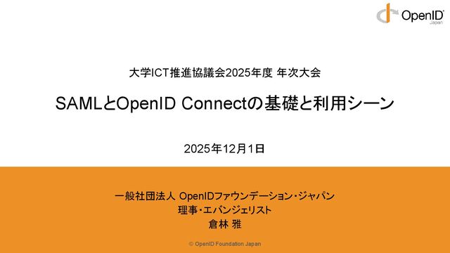 SAMLとOpenID Connectの基礎と利用シーン 一般社団法人 OpenIDファウンデーション・ジャパン 理事・エバンジェリスト 倉林 雅 2025年12月1日
