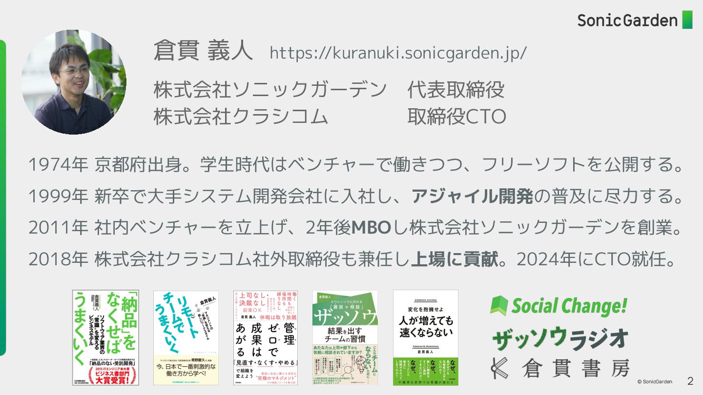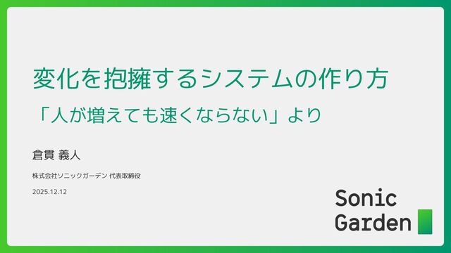 変化を抱擁するシステムの作り方 「人が増えても速くならない」より 倉貫 義人 株式会社ソニックガーデン 代表取締役 2025.12.12