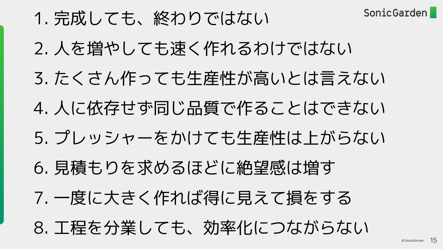 人に依存せず同じ品質で作ることはできない 5. プレッシャーをかけても生産性は上がらない 6. 見積もりを求めるほどに絶望感は増す 7. 一度に大きく作れば得に見えて損をする 8. 工程を分業しても、効率化につながらない